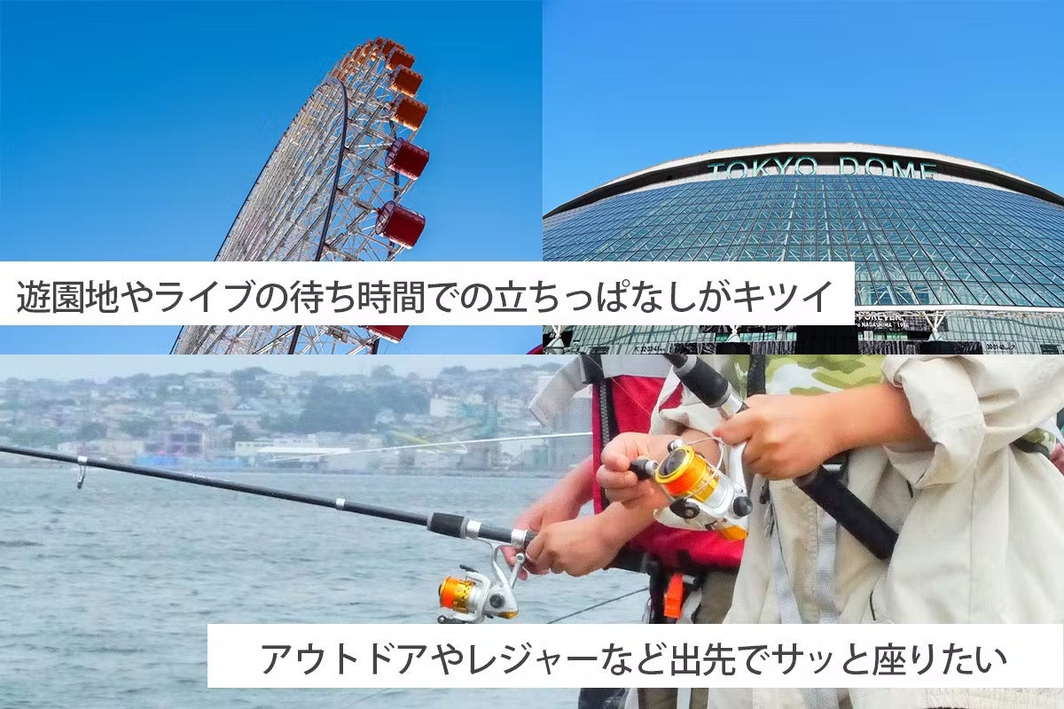 運動会や学校の行事など、人が多くて座れる場所が限られている場面で、クイックチェアはとても便利です。広げるだけで簡単に座れるので、イベント会場で待機中に足が疲れたときにも、すぐに座って休憩できます。軽量で持ち運びやすいので、学校行事の際にもお子さまに持たせてあげると便利です。行列待ちや長時間の観覧にも活躍すること間違いなしです。