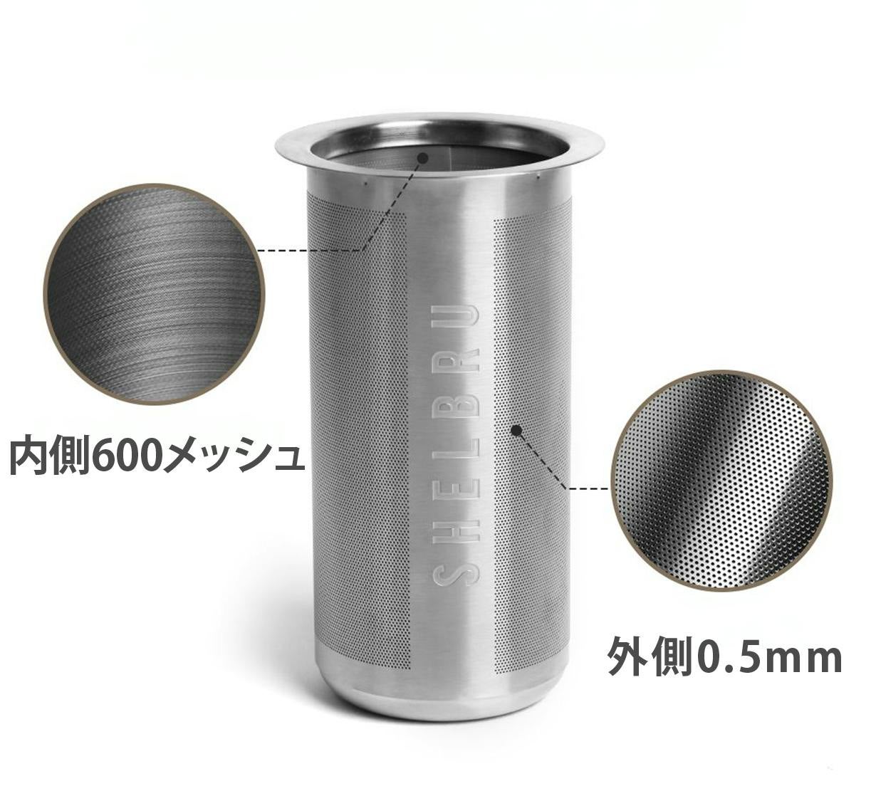 SHELBRUは"ダブルフィルター"を採用。外側は0.5mm内側は600メッシュの目の細かいフィルター。これは、ドリップ用の紙と同レベルの細かさ。