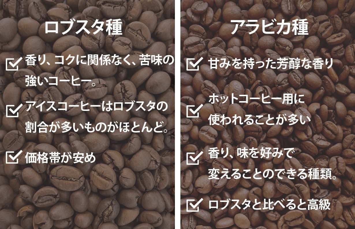 コーヒー豆は大きくロブスタとアラビカに別れます。アラビカ●%なんて言葉を見た事ある方も多いのではないでしょうか?
