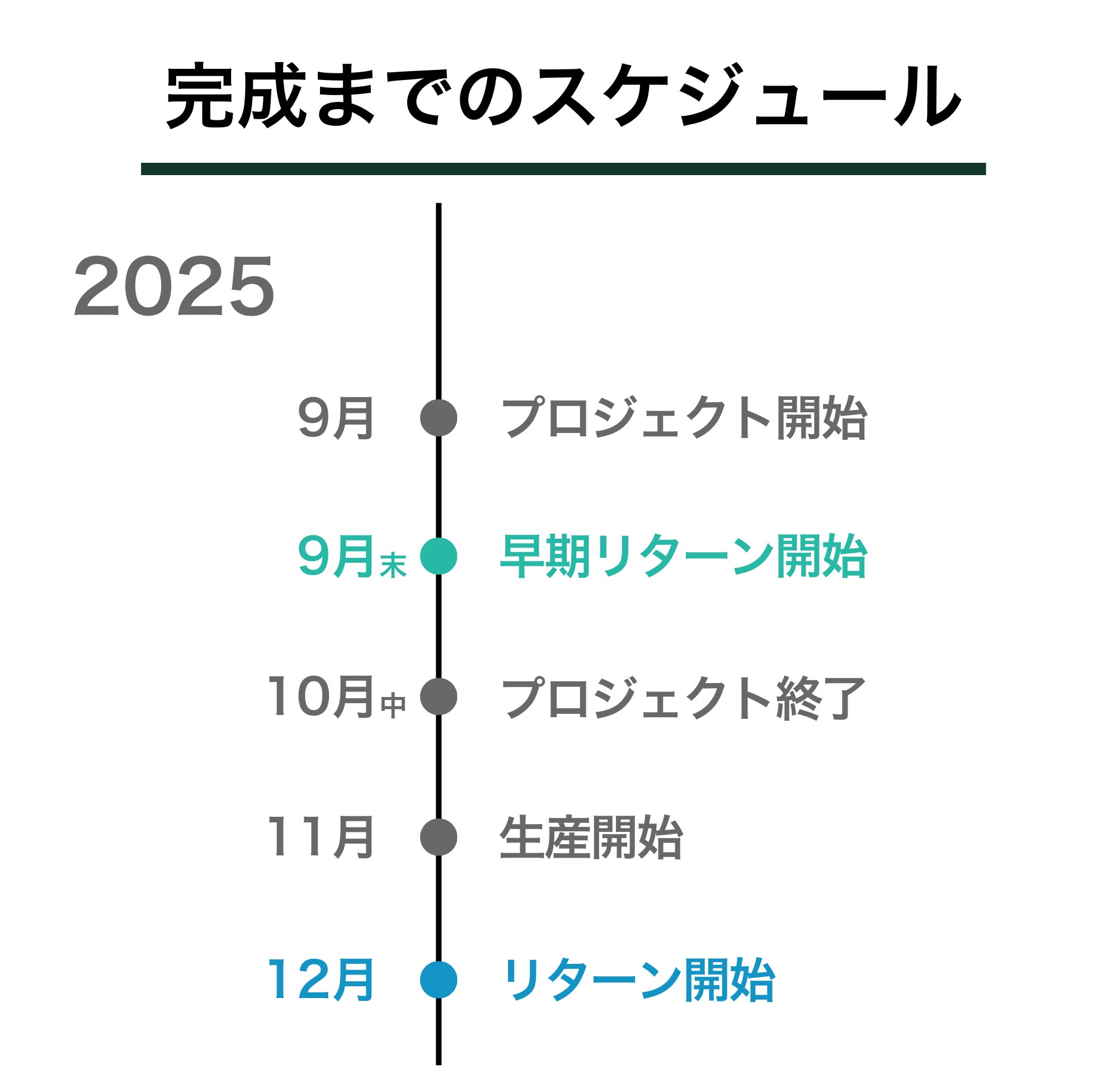 ※本文中に記載させていただいたスケジュールは、あくまでプロジェクト公開時点の予定です。クラウドファンディングを経て輸入を行う性質上、配送遅延のおそれがございます。