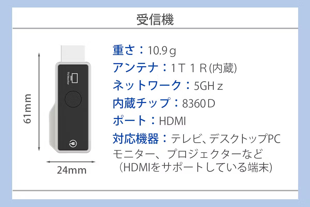 「ミラーリングアダプター」の送信機はType-Cポートを、受信機はHDMIポートを搭載。ビデオ信号と双方向電力伝送に対応しています。