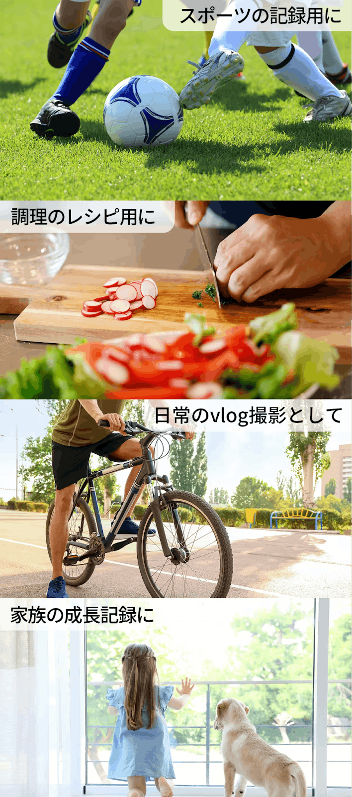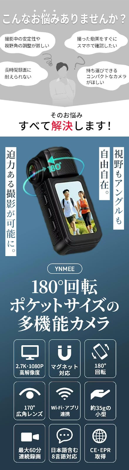 2.7K高解像度、170°広角レンズ、内蔵Wi-Fiによるアプリ操作に対応し、アウトドアや旅行で臨場感あふれる映像を手軽に撮影できる一台として開発されました。