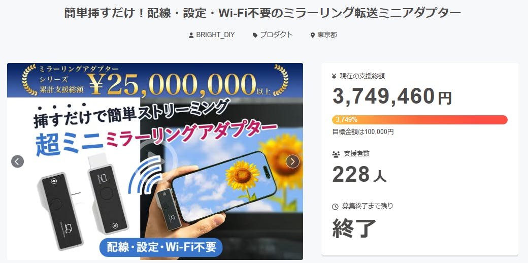 ご支援者様、簡単挿すだけ!配線・設定・Wi-Fi不要のミラーリング転送ミニアダプターにご興味をお持ちいただきありがとうございます。プロジェクト開始から36日目で228人ものご支援者の方々より支援頂き、無事プロジェクト終了を迎えることが出来ました。早速皆様のリターンを2025年11月末にお届けできるよう準備を始めております!皆様にご満足いただけるリターンをお届けできるよう、全力で取り組んで参りますので引き続き、「簡単挿すだけ!配線・設定・Wi-Fi不要のミラーリング転送ミニアダプター」をよろしくお願い致します。BRIGHTチーム