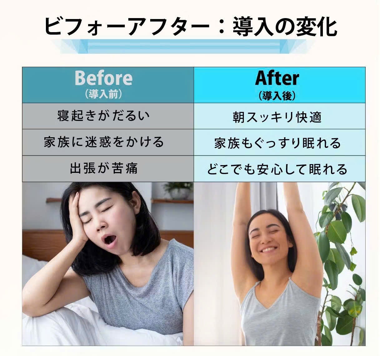 いびきが減少または停止すると、使用者は大きな健康効果を得ることができます。いびきを止めることで、いびきをかく本人も周囲の人々も深い睡眠を得ることができ、睡眠の中断が減ります。質の良い睡眠は体を回復させ、エネルギーを再生するため、疲れを軽減し、全体的な健康を向上させます。また、良質な睡眠は翌日の目覚めを爽快にし、疲れにくく、集中力を高め、仕事の効率を向上させます。