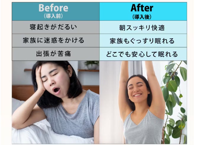 SLEEP MAGICは、特にいびきに悩む方におすすめのデバイスです。自分のいびきが原因で家族やパートナーの睡眠を妨げてしまい、気まずさやストレスを感じている方にとって、いびきを軽減することで快適な眠り環境を取り戻す助けになります。いびきが原因で起こる睡眠不足や体調不良の改善にもつながるため、多くの人に支持されています。