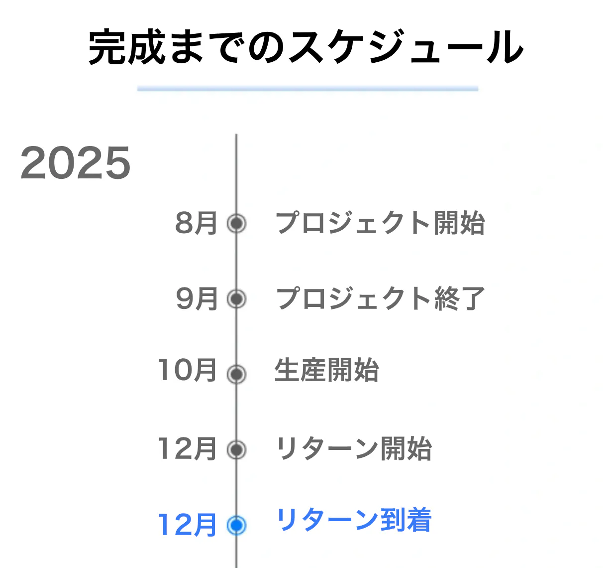※本文中に記載させていただいたスケジュールは、あくまでプロジェクト公開時点の予定です。クラウドファンディングを経て輸入を行う性質上、配送遅延のおそれがございます。