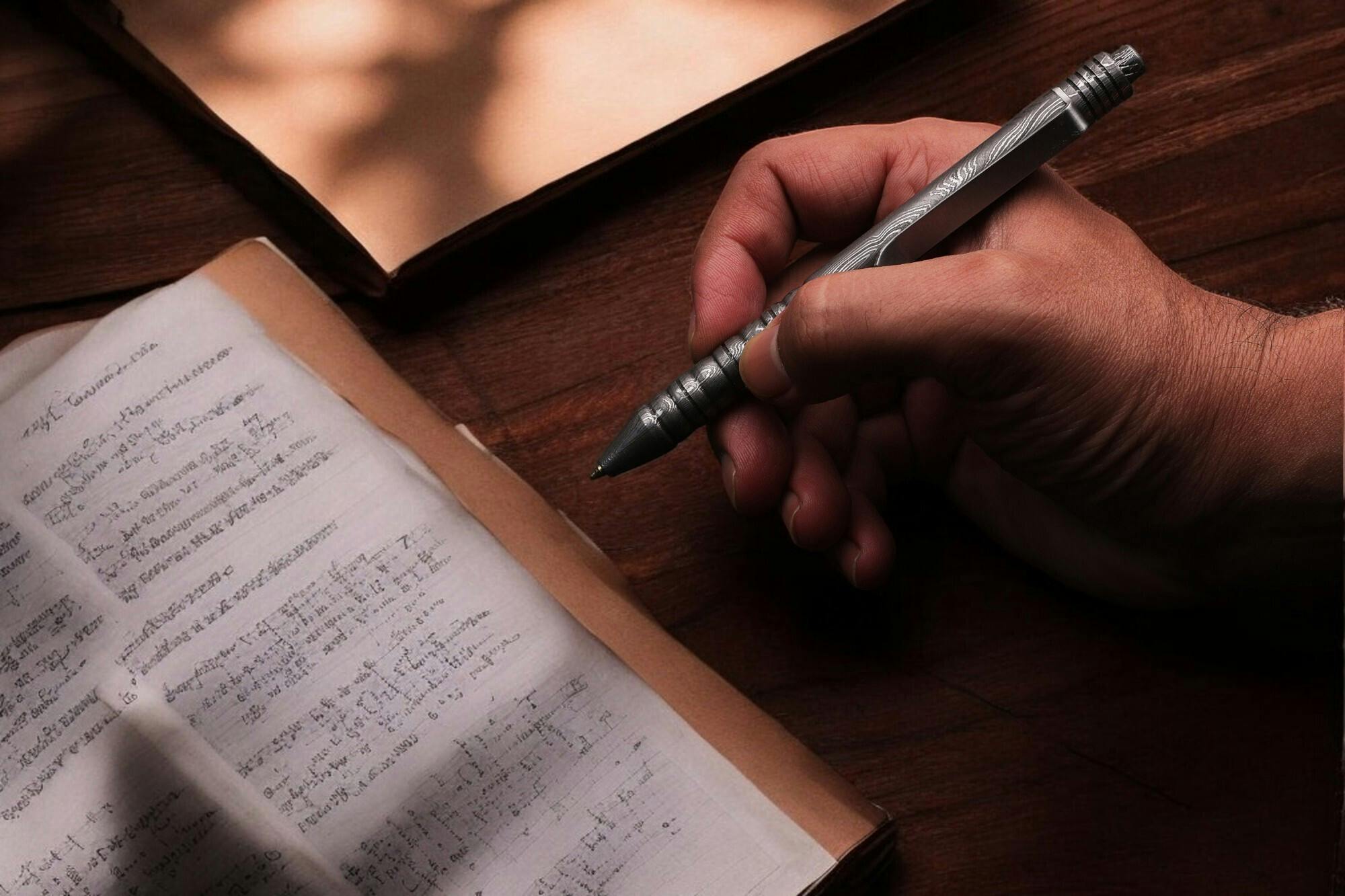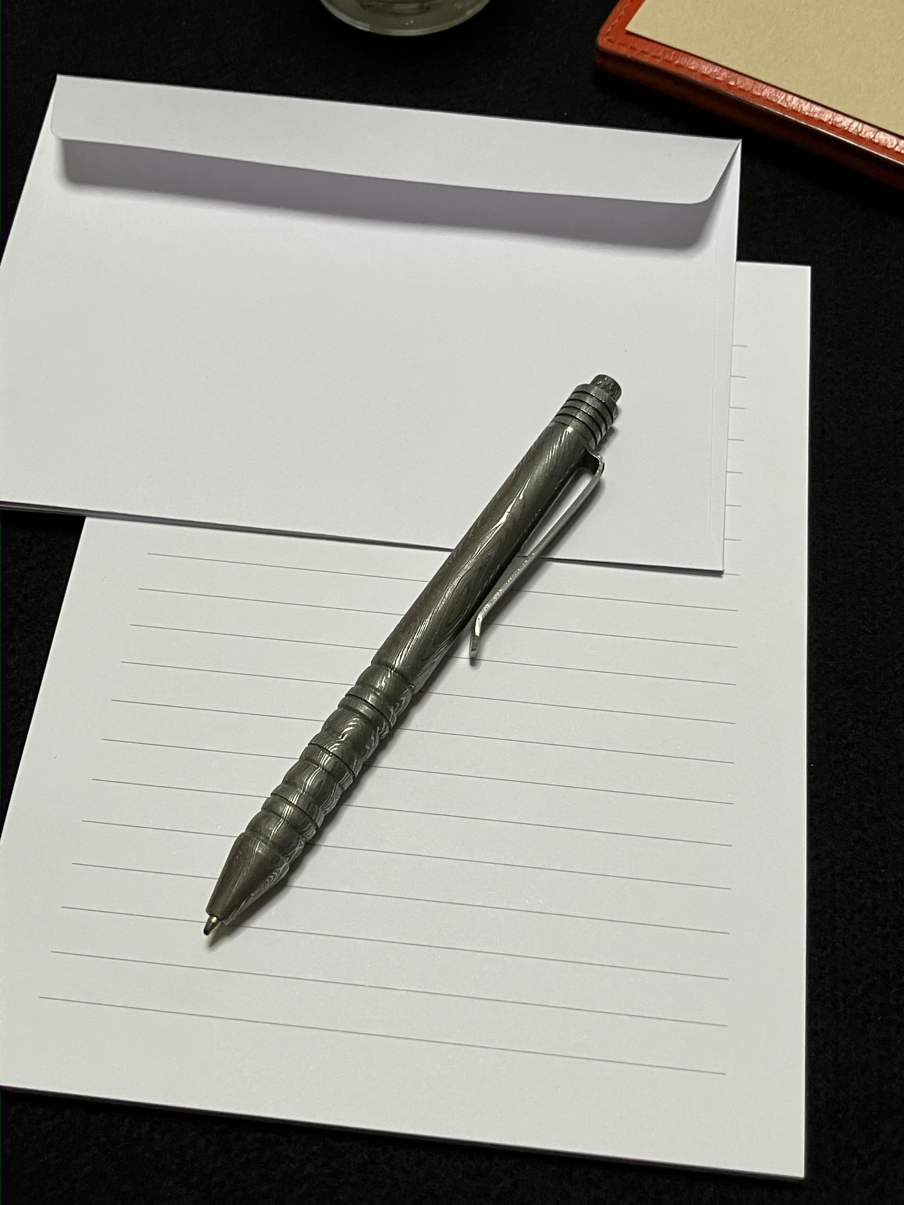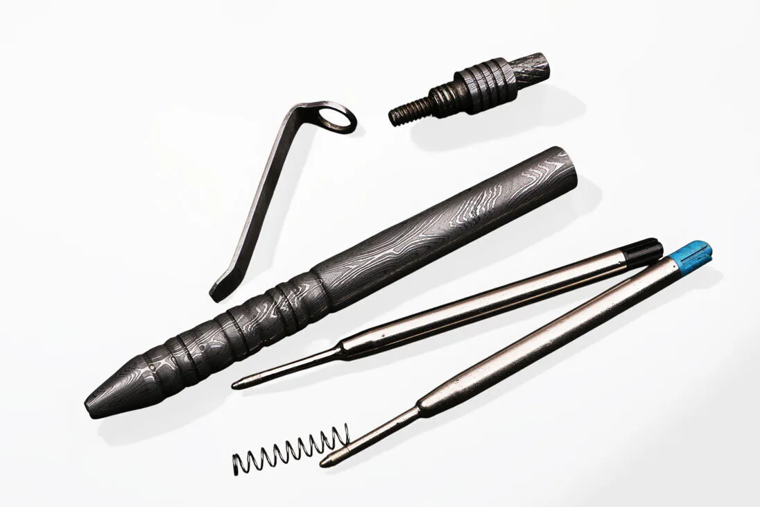 - ナイフに加工される高品質のダマスカス鉄鋼が、ボールペンになりました。