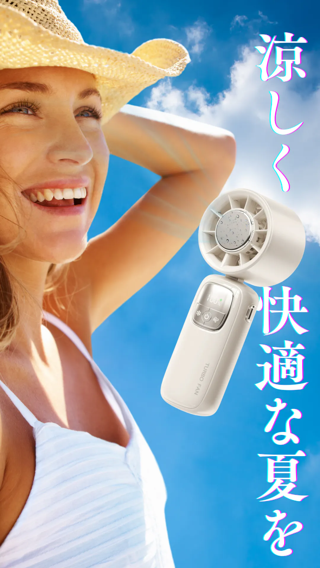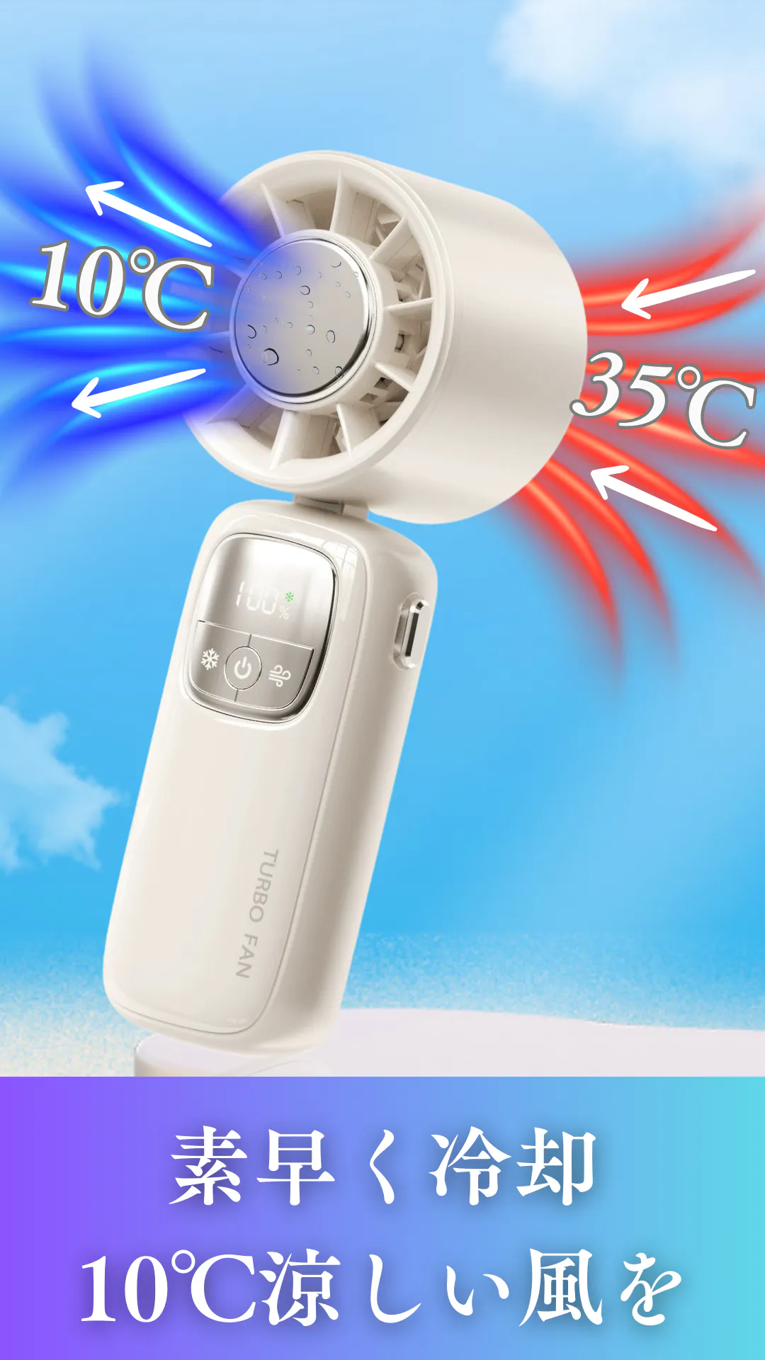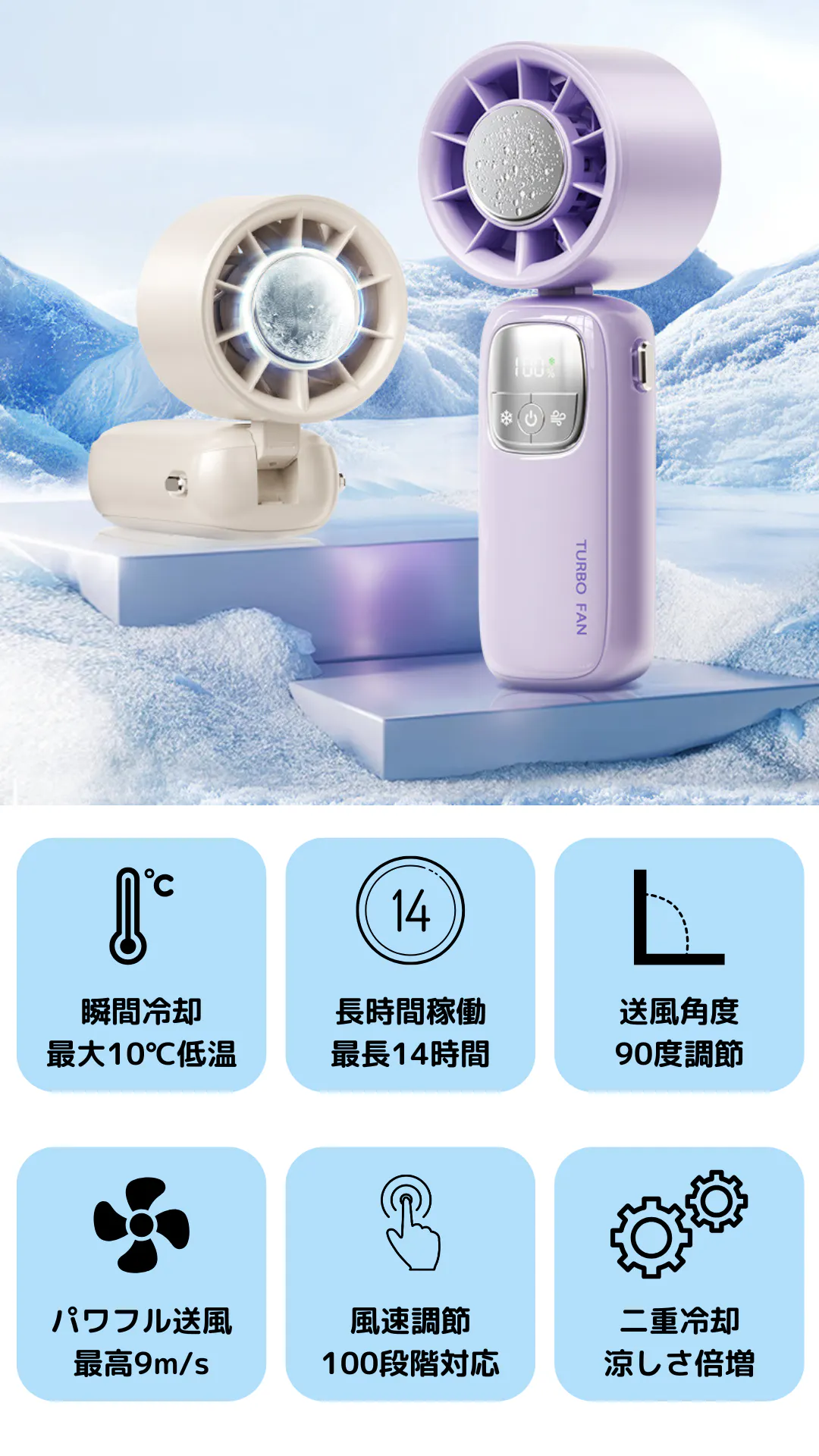 『TURBO FAN』は、超伝導冷却技術×パワフル送風のW冷却システムを搭載し、さらに最大14時間の連続使用や1~100段階の風量調整など、使うシーンに合わせた快適な機能を備えています。