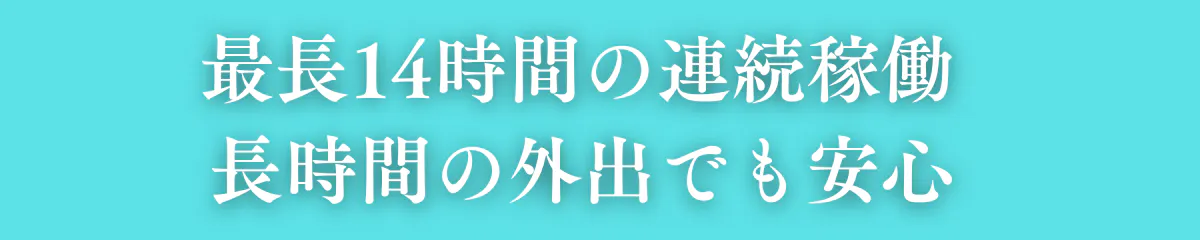 大容量バッテリーを搭載し、1回のフル充電で最長14時間連続使用が可能!朝から晩まで使えるので、通勤・通学、スポーツ観戦、旅行、アウトドア など、長時間の外出時でも安心。