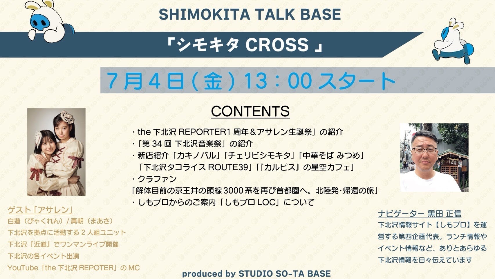 明日、7月4日アサレンが新らしく下北沢にできたスタジオ「STUDIO SO-TA BASE」(X公式アカウント: @STUDIOSOTABASE)から新番組「シモキタ CROSS」に生出演します!番組ナビゲーターは下北沢情報サイト「しもブロ」の黒田さんです。以前、the下北沢REPORTERで、下北線路街ツアー編に出演いただいた下北沢を愛する男です。ここで、たっぷりとこのクラウドファンディングのプロジェクトについて宣伝してさせていただきます!ぜひ、ご視聴ください。