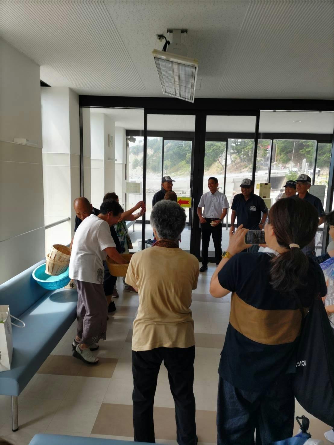エアコンをつけた休憩所でナーガおばあちゃんが感謝の餅まきをしました。