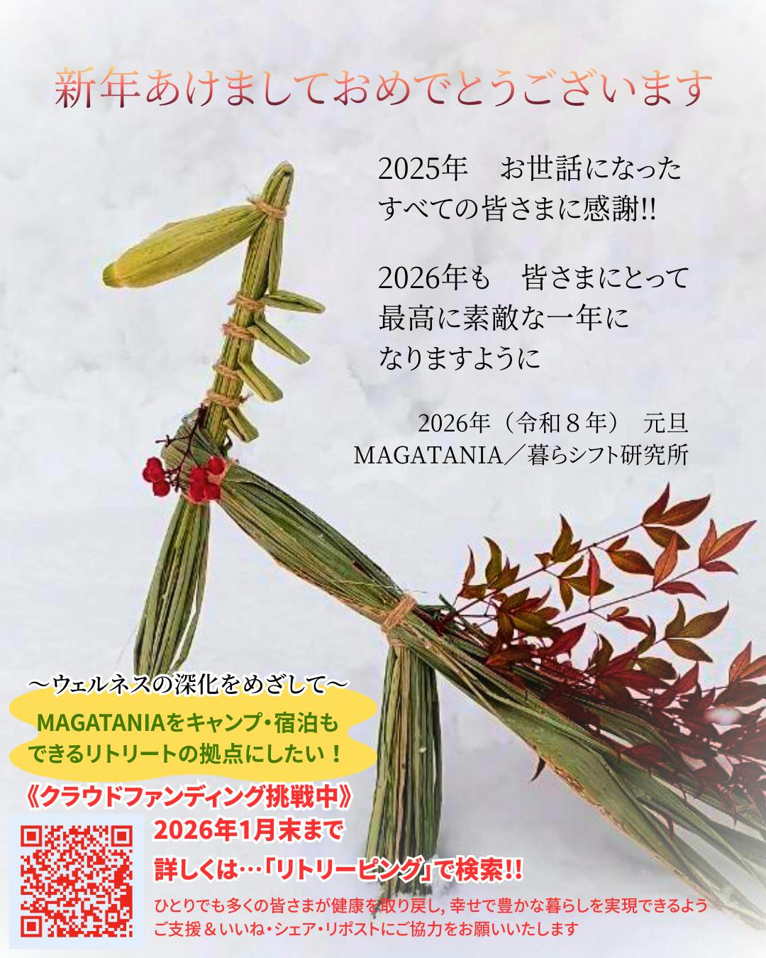 2026/01/01 15:48新年あけましておめでとうございます。ヴィーガンレストランMAGATANIAの創業5周年を機に、これまでの知識と経験を総動員した新規プロジェクト「リトリーピング」事業のクラウドファンディング、残り1ヶ月となりました。本年は、私たちにとって大きなチャレンジの年になります。引き続き、ご支援&情報拡散のご協力をよろしくお願い申し上げます。■ショート動画配信スタート!今回整備する、森の中の究極のリトリート拠点「MAGATANIA RETREAPING VILLAGE」の魅力や特徴を完結にまとめたショート動画を、今日からしばらくの間、できるだけ毎日配信していく予定です。下記リンクのYouTubeのほか、インスタ・Facebookのリールでも配信していきます。いいね・シェア・リポスト等にご協力をお願いいたしますm(_ _)mhttps://www.youtube.com/playlist?list=PLQG0ktiePfIH5Sh59fMcRxeOk0RdwJrkY■チラシのダウンロードはこちらから!このクラファンのA4チラシを、下記リンクよりPDFデータでダウンロードできます。裏面にはリターンがカテゴリごとに分かりやすく一覧表示されていて、見比べやすくなっています。メールに添付したり、プリントアウトして手渡したりするのにご利用くださいm(_ _)mhttps://drive.google.com/file/d/1cL8k5AAGasid4wanjUpLY8RNSLdm_vRl/view?usp=sharing もっと見る