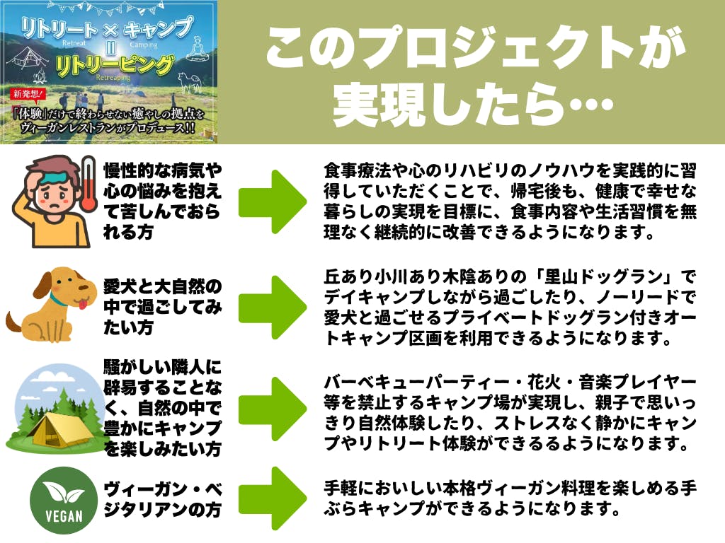 …ズバリ!お客さまの心と身体を癒やし、健康に関するありったけの情報と経験を持ち帰っていただく、究極のリトリートキャンプ場を実現します!!