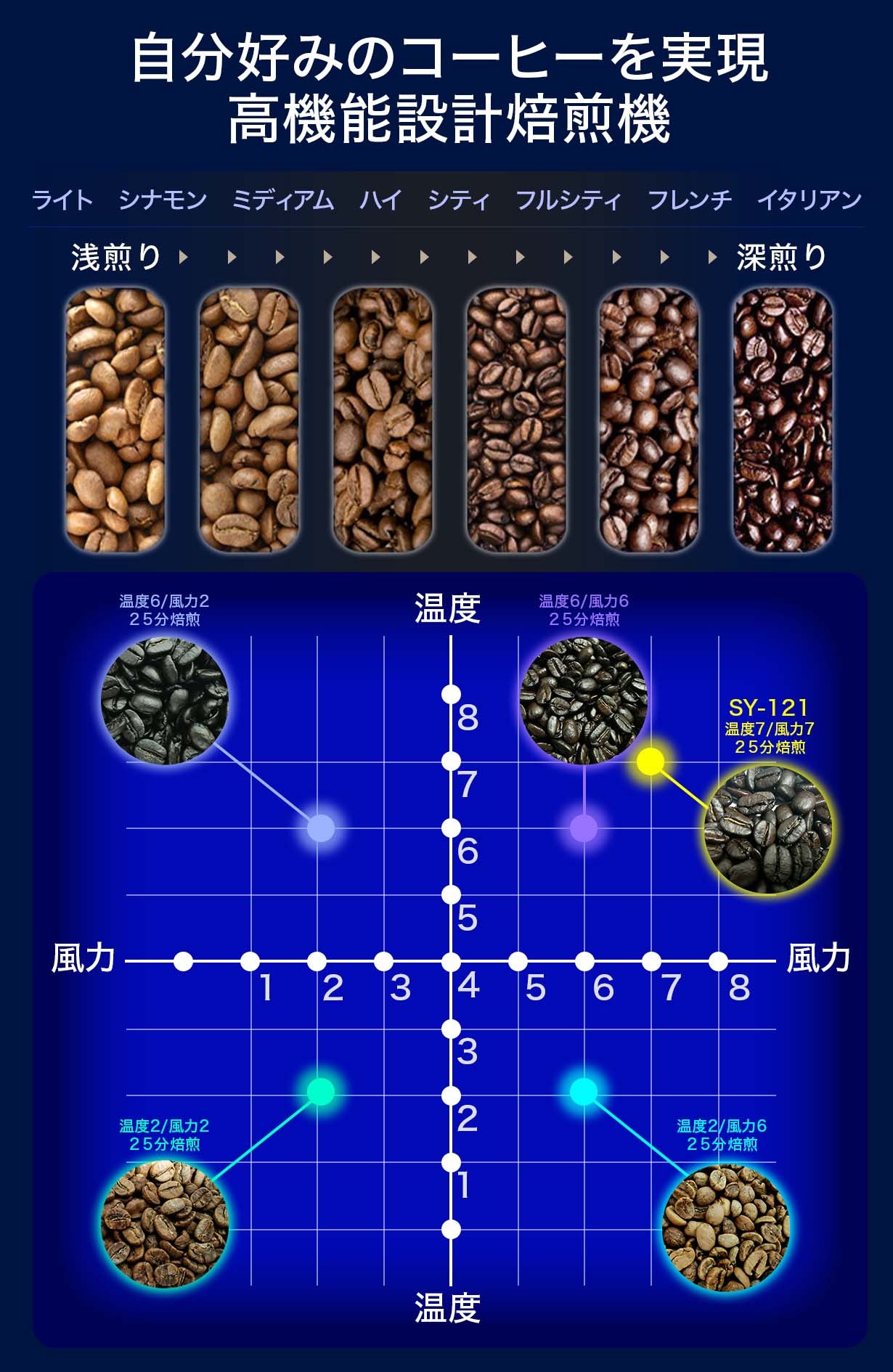 温度・風力が1〜8段階で調整できるようになったことで、焙煎度の幅が大きく広がりました。上記グラフを目安に設定することで、より自分好みの仕上がりに近づけることができます。