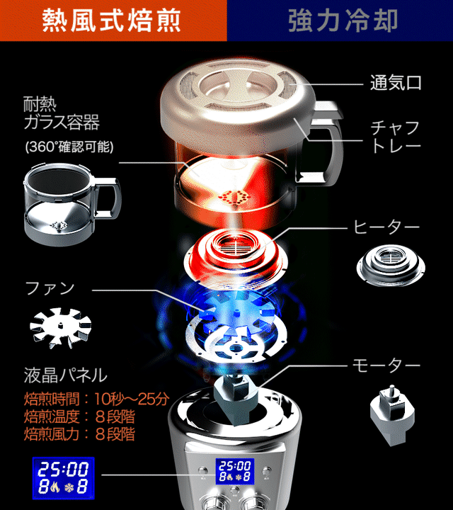 本商品は、焙煎時の温度と風力を8段階まで調節することができ、焙煎時間と冷却時間をそれぞれ10秒単位で増減することが可能です。また分解可能な設計となっている為、使いやすく水洗いも可能です。