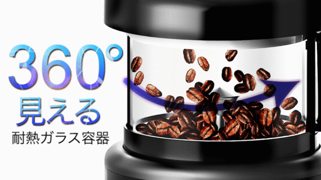 耐熱ガラス容器により、焙煎の様子を360°全方向から確認可能。生豆が徐々に色づいていく変化を楽しみながら、好みの焙煎度合いを目で見て調整できます。上から覗き込む必要がないため、蒸気による火傷のリスクも低減。安心して本格焙煎を体験できます。