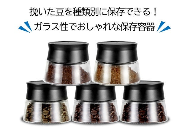 追加オプションのガラス製保存容器ならお手軽にコーヒー豆の保存が可能です。