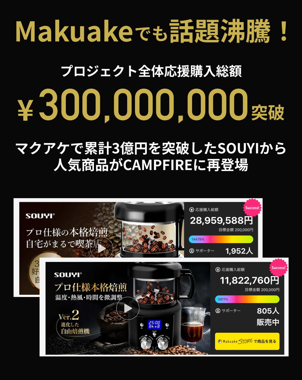 2025/09/12 18:00こんにちは、ソウイジャパン株式会社です。「本格微調整コーヒー焙煎機」プロジェクトに多くのご支援をいただき、誠にありがとうございます。■ いよいよ明日、9月13日で終了ついにプロジェクト終了まで残り1日となりました。9月13日(土)をもって、リターン購入の受付は終了となります。ご検討中の方は、ぜひこの機会をお見逃しなく!■ 9月17日より順次発送予定ご支援いただいた商品の発送は、9月17日(水)より順次開始を予定しています。楽しみにお待ちいただいている皆さまに、一日でも早くお届けできるようスタッフ一同、準備を進めております。■ 最後まで応援よろしくお願いします残りわずかの期間、最後まで皆さまと一緒にプロジェクトを盛り上げてまいります。引き続きの応援をどうぞよろしくお願いいたします。ソウイジャパン株式会社スタッフ一同\ 同じく明日プロジェクト終了 /これ1つで家中を一掃!強力吸引・洗浄除菌・自動乾燥を搭載のブラックホール掃除機【家中を一掃する】自社史上最高レベルの「強力吸引」と「密着圧力水拭き」【目に見えない汚れや菌から解放】ウルトラ除菌水を自動生成、除菌 【ニオイの元となる汚れを徹底洗浄】除菌水洗浄・80℃ヒーター・通気口搭載で速乾数量限定!一番お得に購入する▶︎ もっと見るお急ぎください!どこよりも安い2週間!