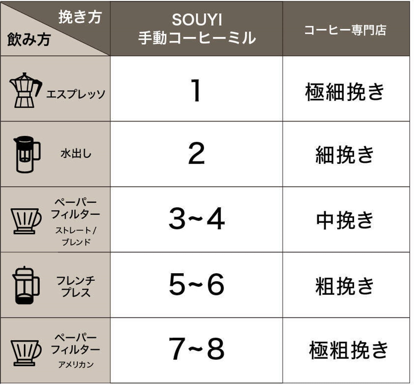 表の数字は手動式ミルの目盛りです。普段ミルをご使用されない方はコーヒー豆を挽くときの目安にしてください!