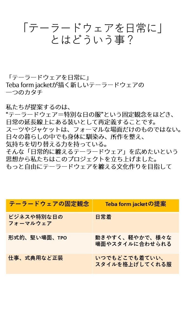 世界三大ジャケットのひとつ「テバジャケット」を選んだ理由はいくつかあります。※以前の活動報告でも少し説明しておりますがその思想を体現する最初の選択肢として、私たちはスペイン発祥の「テバジャケット」に着目• 元々は貴族が狩猟や乗馬など、日常の活動の中で着用していたジャケット• 肩パッドや芯地を排した構造で、動きやすく、軽やか• テーラードの品格を保ちながら、カーディガンのような気軽さを持つこの“構造と思想のバランス”こそ、私たちが目指す「日常に溶け込むテーラードウェア」の理想形の一つでした。Teba form jacketが目指す体験Teba form jacketは、ただの仕立ての良い工場で作られた服ではなく「装うことが、日常の質を高める」という体験ができるプロダクトの提案です。• テーラードウェアに袖を通すことで気持ちが整う事もある• 様々な場面で自然体のまま品格を纏える• 動きやすく、疲れにくく、長く着られ、様々なファッションと融合できるこのジャケットを通じて、私たちは「テーラード=日常」の文化を育てていきたいと考えています。(スウェットウェアとタイドアップスタイルのTeba form jacketによる融合スタイル。ちょっとストリートMIXしてみたりもできます。スラックスに変えればそのまま普段のビジネススタイリングでも。)文化として広げたい「日常に纏えるテーラードウェア」の思想Teba form jacketは、その第一歩です。今後は、更にバリエーション展開や、他のテーラードアイテムの再解釈も視野に入れています。目指すのは、“着る人が選択肢を広げること”。そして、“装いを通じて、日常を豊かにしていけることを広げること”そんなプロジェクトです。(サファリタイプのセットアップ。今回のリターンには入れておりませんが、こちらのタイプもお納期頂ければご相談の上対応可能です。)