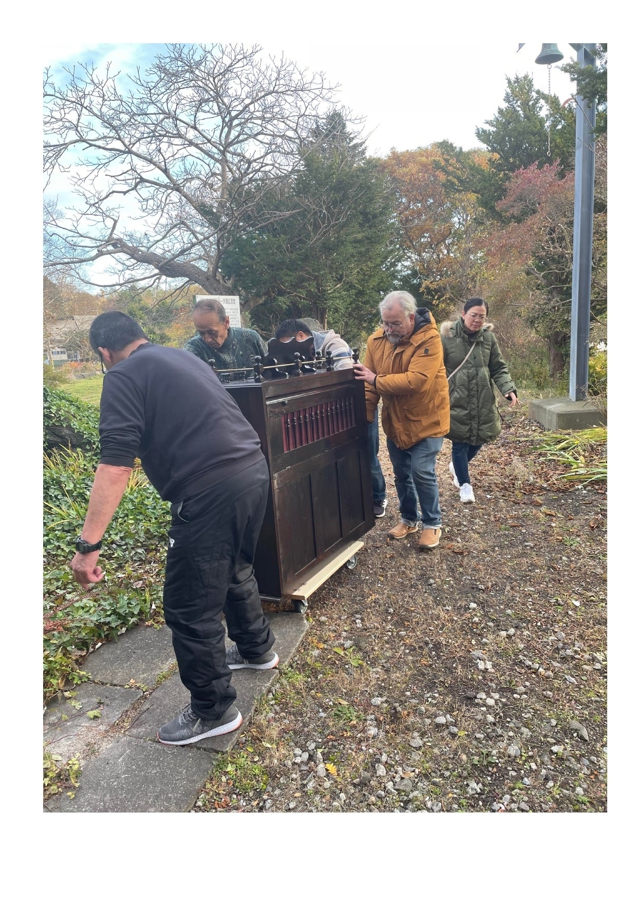 (写真 カムイタッコプ(神の丘)を登り、礼拝堂に搬入されるオルガン)