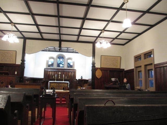 1937年に建立された石造りの現聖堂内には、宣教師ジョン・バチラーと八重子氏の功績を