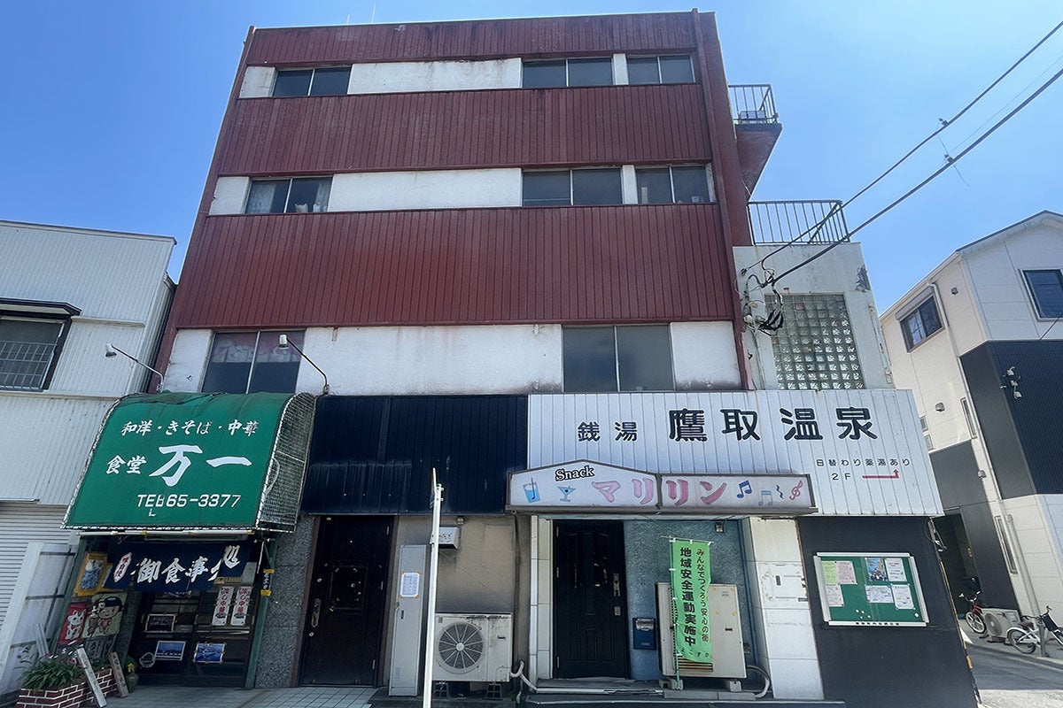という構想があります。この鷹取温泉、実は4階建てのビルの2階に位置しています。3・4階はアパートになっていて、1階には「食堂万一」さんが今日も大盛メニューで営業されていて地域の人々に愛されています。