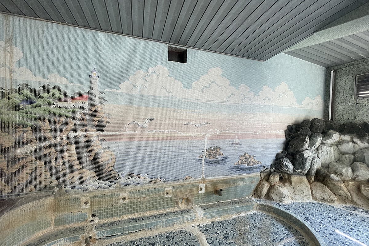 このプロジェクトの舞台となる鷹取温泉にはとてもすばらしい昭和の銭湯壁画が残っています。銭湯といえば富士山ですが、ここは違うんです。美しい海岸に白鳥がいる風景や海とカモメと断崖絶壁。かわいいおさかなたちが泳いでいる洗い場。男湯にはなんと女性のセクシーな裸体が描かれているんです。しかもそれらはすべてタイルで描かれているんです。こんなすばらしい銭湯はなかなかありません。ほかにも浴場のいたるところに美しいタイルがあしらわれています。私もよくタイルを使いますが、こんなに見事なタイル仕事は見たことがないと一目ぼれしたのが始まりでした。