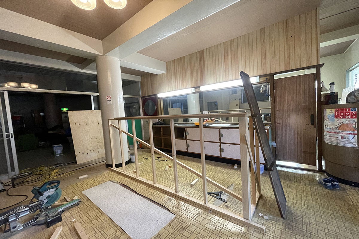 男湯は営業当時の風景に限りなく近づけるよう、腐敗した箇所の補修がメインです。腐っていた床を補強し、桜のフローリングを貼りました。落ちていた天井も補修し、和式トイレを洋式に変更。脱衣場の隅っこにミニキッチンを設け、最低限のキッチン設備(冷蔵庫・製氷機・2槽シンク・卓上コンロ・電子レンジ)を備えています。脱衣場・浴室ともに広いスペースが使えるのでワークショップやマルシェの開催、アートギャラリーとしての利用などが可能です。ミニキッチン付きなので簡単なお料理や飲み物も提供できます。女湯は脱衣場にバーカウンターを設けます。大きな浴槽内は床を貼ってステージになります。ミニライブやエンターテインメント、1日カラオケバーをやってもいいかもしれません。両方とも飲食店営業許可を取得予定です。