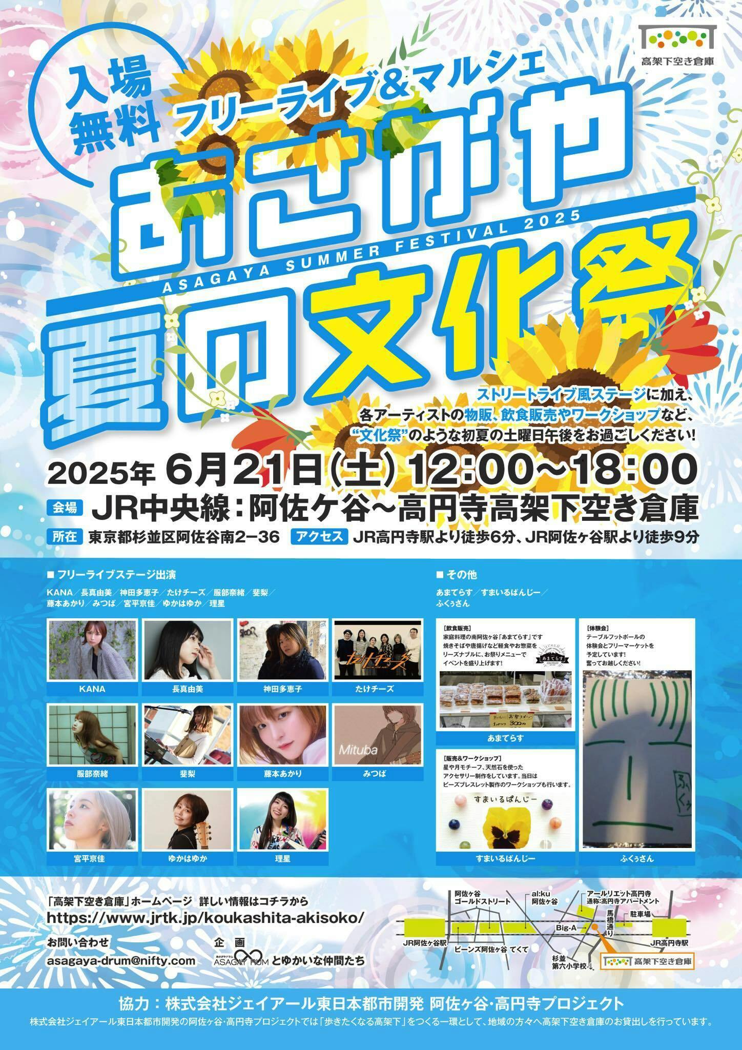 JR阿佐ヶ谷駅~高円寺駅高架下空き倉庫を会場に、コロナ禍の2021年から開催しているあさがや文化祭シリーズ! 今年も「春の文化祭」に続き『あさがや夏の文化祭2025』開催決定! フリーライブに加え飲食販売や体験会など、誰もが楽しめる空間を作ります 一緒に楽しい文化祭イベントを作りあげましょう!