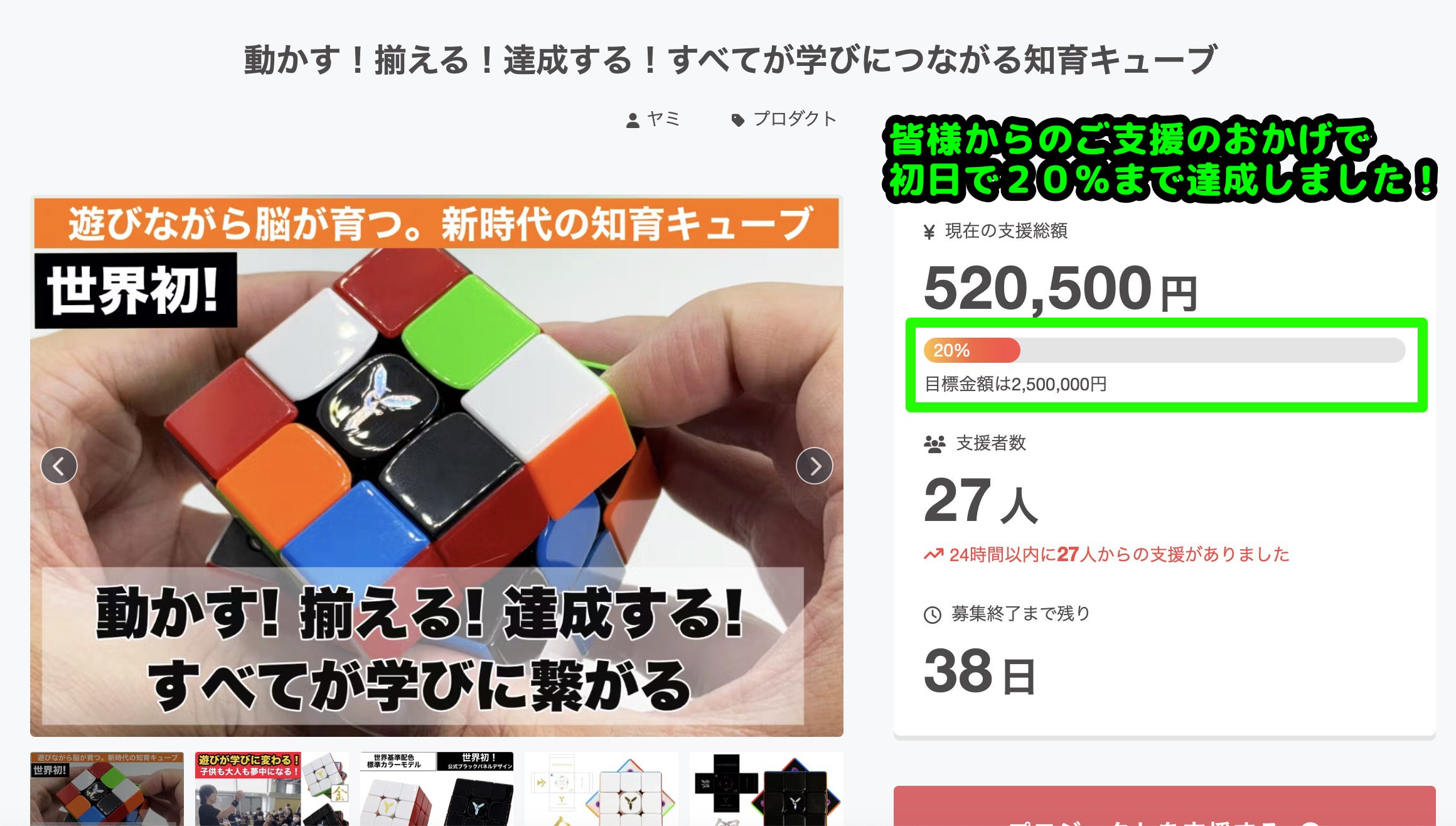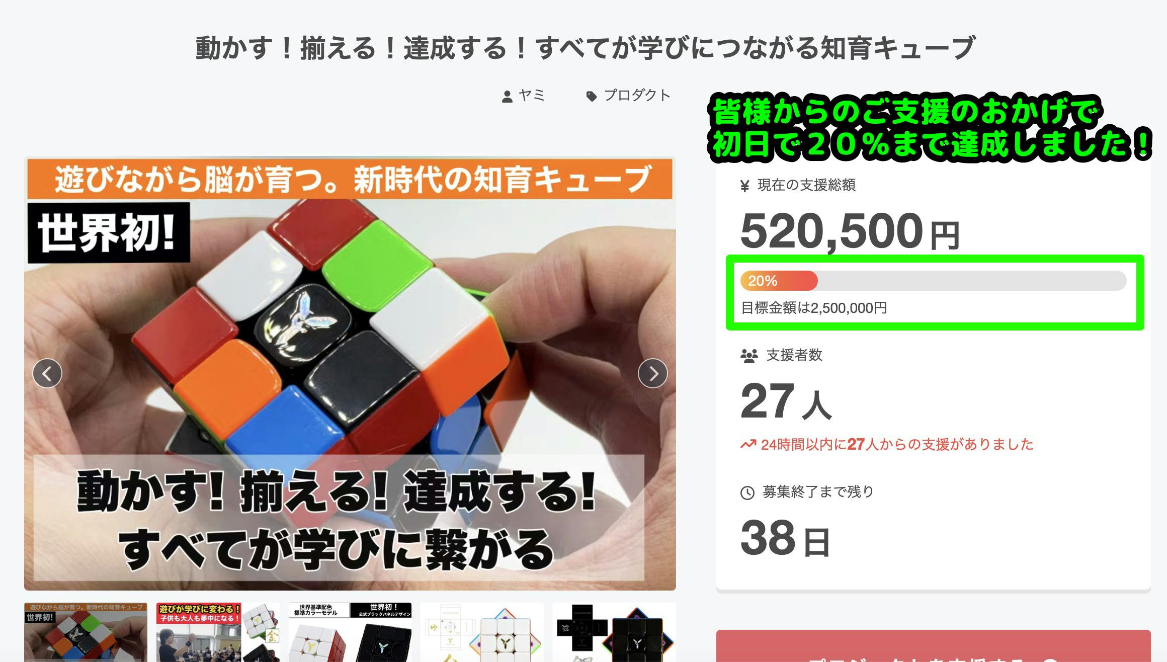 クラウドファンディング開始からわずか1日で、目標金額の20%を達成することができました。