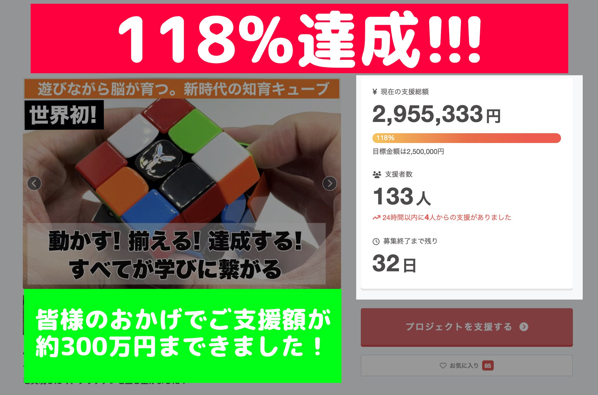 目標金額の118%を達成し、ご支援金は約300万円に到達しました!