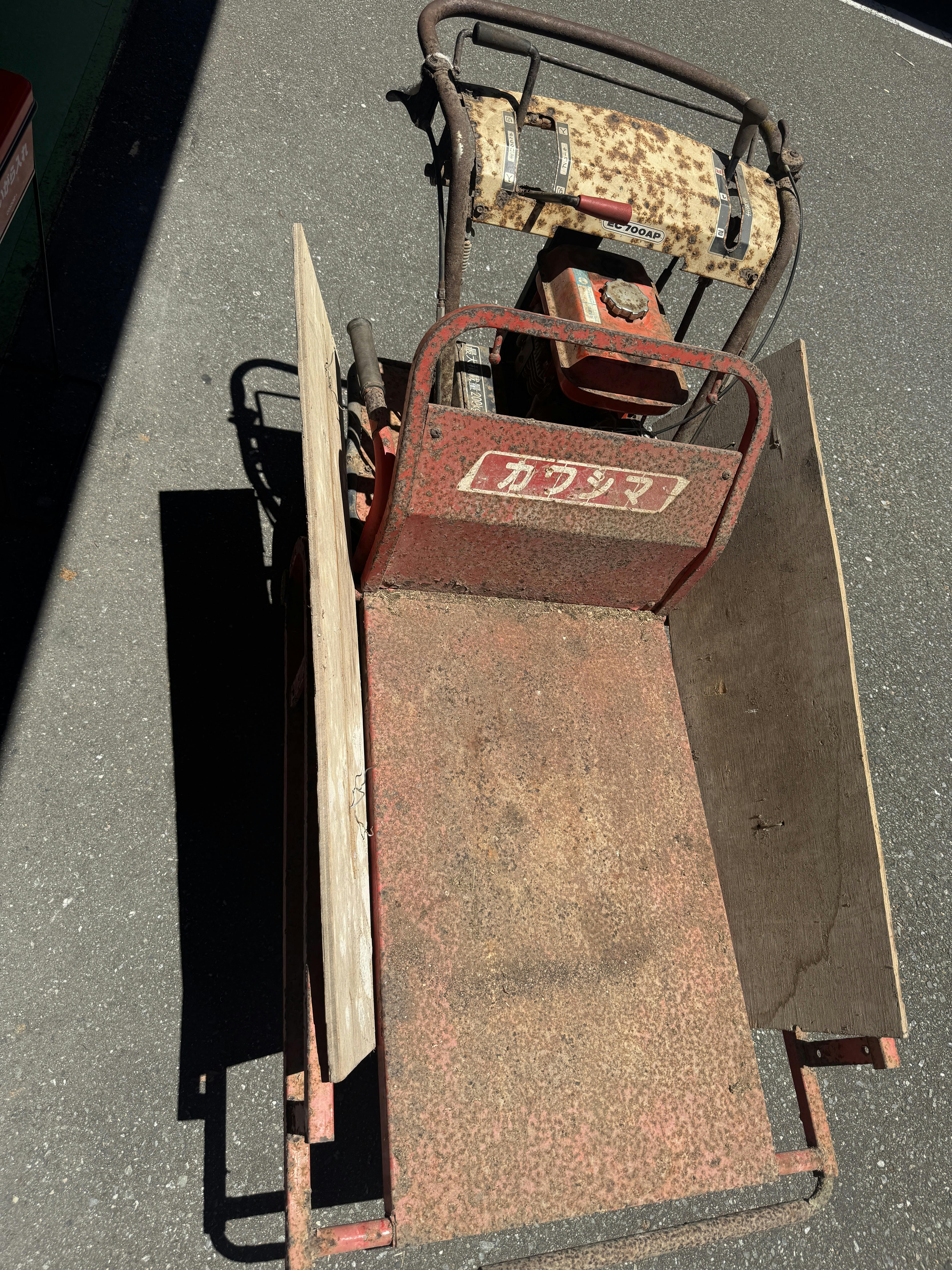 活動報告|ボロボロだった運搬車を再生中!before → after に向けて、動き出しました!この写真に写っているのは、何年も動かず放置されていた古い運搬車です。ハンドルはサビだらけ、ボディもボロボロ。「もう使えない」と処分されそうになっていたところを、譲っていただきました。少しずつ、整備しています。現在は、 サビ取り、グリスアップ 、木板の交換、 配線チェックなど、ひとつずつ手を入れていっています。目的は、「もう一度、畑で使うこと」農家さんが手作業で何度も往復していた畑に、この運搬車が復活すれば、作業効率がぐっと上がります。壊れた機械に、もう一度命を。それが私たちのテーマです。ご支援、本当にありがとうございます!皆さまの支援のおかげで、こうした再生作業が進んでいます。今後も修理の様子や、再生後の姿を発信していきますので、楽しみにしていてください!