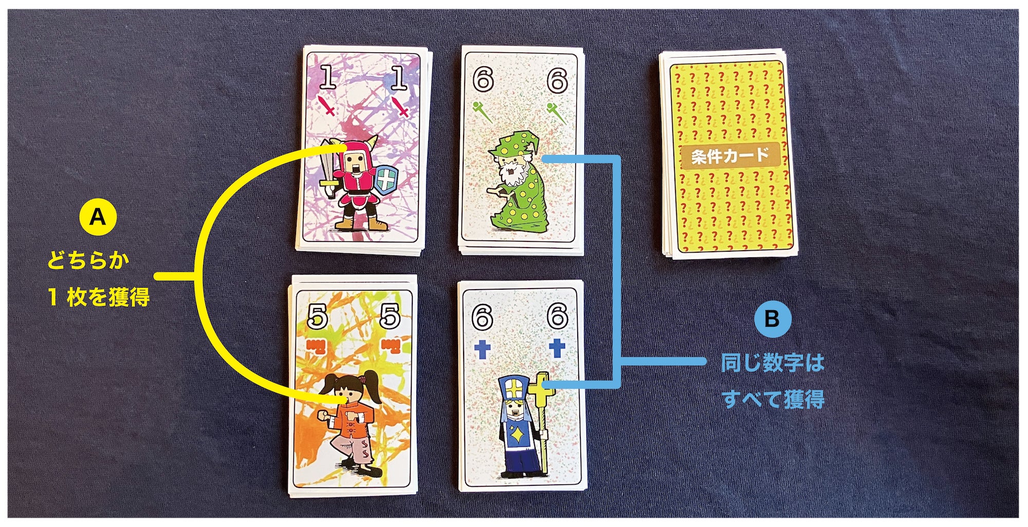 適当な方法でスタートプレイヤーを決め、「条件カード」を2枚引きます。