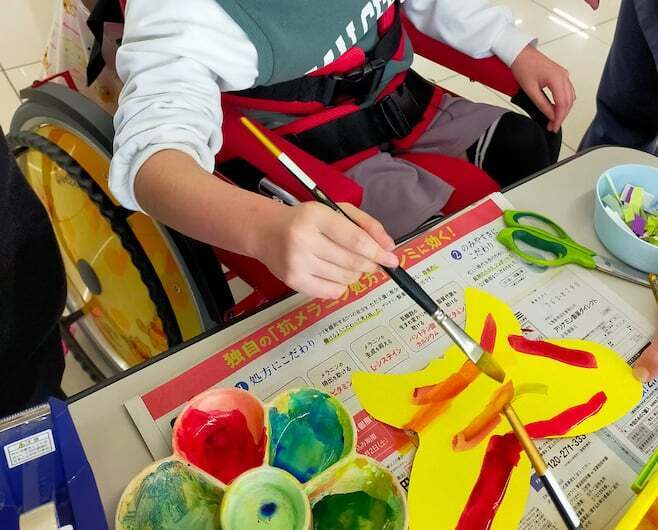 アート活動といっても、筆やペンを持って絵を描くことはできず、絵の具をつけたビー玉を転がすなど動く一部の指を使ったことしかできません。