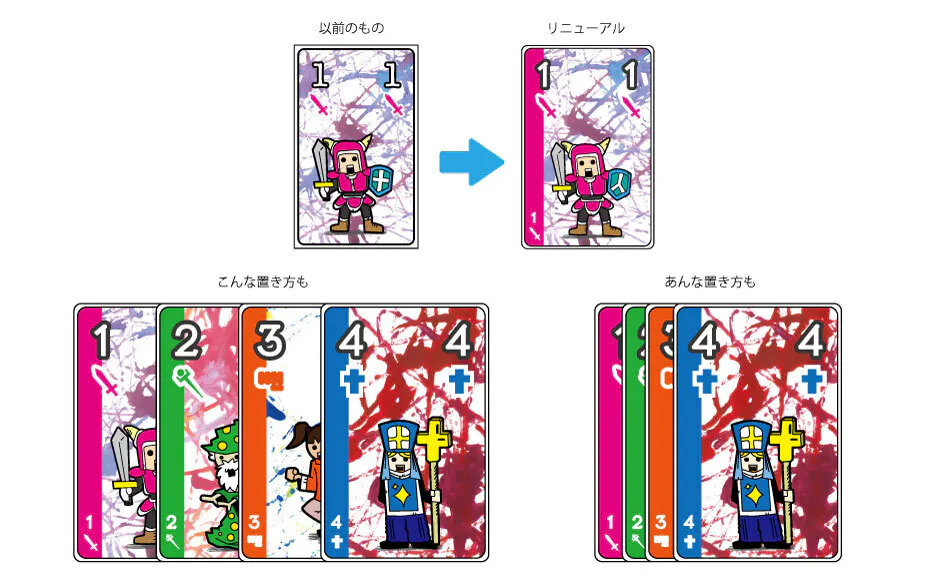 ということで、製品版は、重ねても何色(どの職業)を持っているのかわかるようにカードの端に色とマークをつけるデザインに変更します。