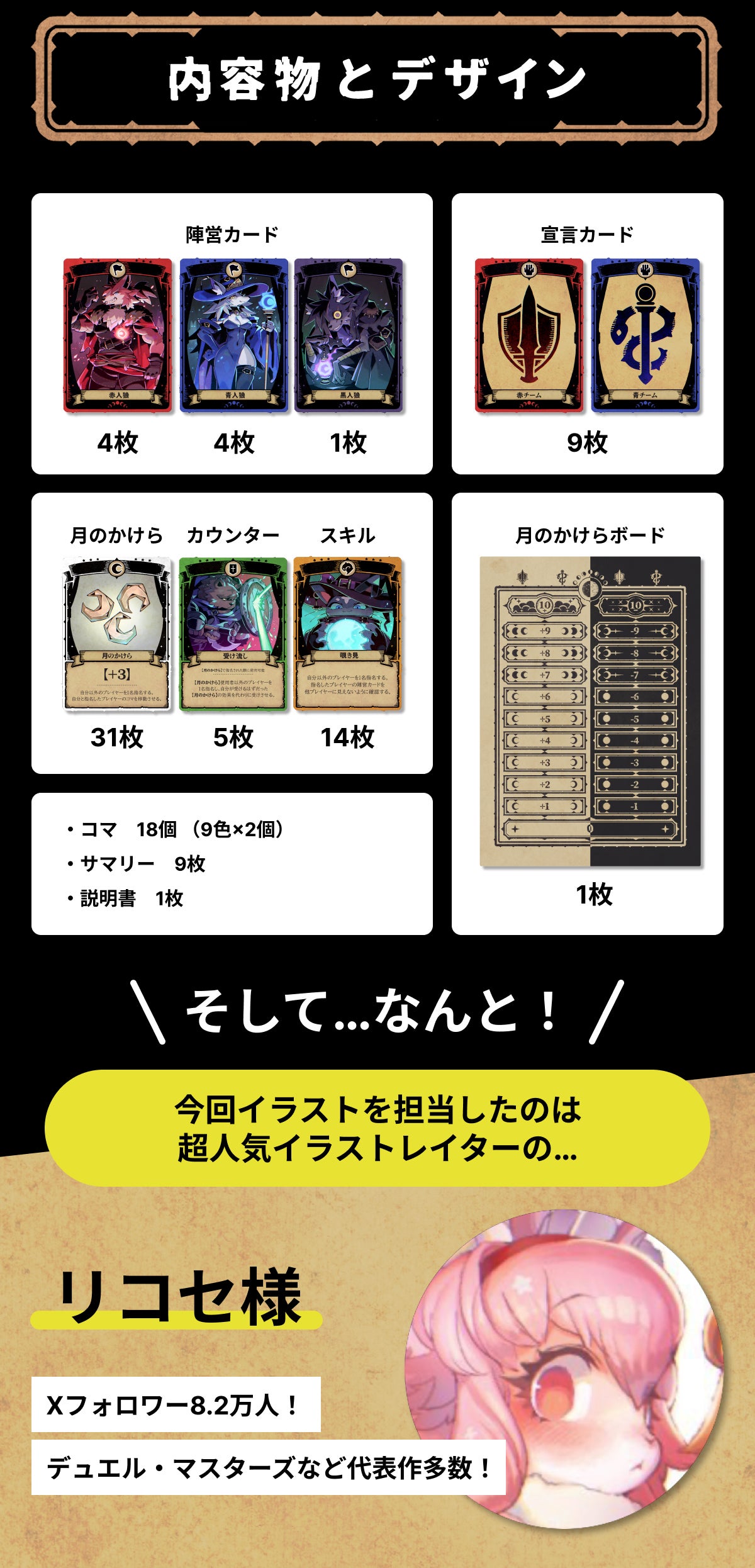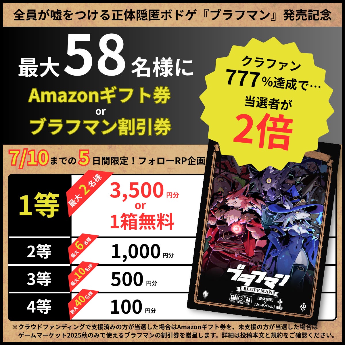 2025/07/05 18:14こんにちは『ブラフマン』を制作したボドゲサークル「大人の休み時間」です!今回初のクラファンですが、ありがたいことにとても好調で、なんと黒字化が見えてきました…!ご支援いただいた皆様、拡散いただいた皆様本当にありがとうございました。せっかくいただいた支援金ですので、懐には入れず、よりブラフマンが多くの方に知ってもらえるよう広報に回させていただければと思い、今回Xにて⦅最大58名⦆に抽選で当たるリポストキャンペーンを開催しました!該当のポスト:こちらをクリック支援済みの方も当選を喜んでもらえるよう、「支援者」と「未支援者」で景品を変えております。すでに支援済みの方も、支援しようか迷っている方も、どちらもお得になるキャンペーンにしております!よろしければ下記をご確認ください!===【キャンペーン概要】Xでキャンペーン用のポストをリポストしていただくと…最大3,500円分(ブラフマン1箱分)の賞品プレゼントさせて頂きます!⦅支援者が当選された場合⦆Amazonギフト券を送らせて頂きます。1等 3,500円分2等 1,000円分3等 500円分4名 100円分※リターンA/F/Gなど、『ブラフマン』本体を含まないプランでご支援いただいた方は、ゲムマ会場での本体受け取りやブラフマン割引券など、未支援者と同じ景品内容となります。⦅未支援者が当選された場合⦆ゲームマーケット2025秋の会場にて以下をプレゼントさせて頂きます。1等 ブラフマン1箱(1〜2名)2等 1,000円分のブラフマン割引券(3〜6名)3等 500円分のブラフマン割引券(5〜10名)4名 100円分のブラフマン割引券(20〜40名)【当選者数について】通常でも29名様に当選しますが…さらに!クラファンが⦅777%⦆を達成した場合は当選者数が2倍に!→ 最大58名様1等:1名→2名2等:3名→6名3等:5名→10名4名:20名→40名※詳しくは該当のポストをご確認ください。正直なところ…大人の休み時間はXのフォロワー数が少なく、期間の7/10までの超短期間のため当選可能性がかなり高いかと思います。よろしければブラフマンのさらなる加速のために拡散のご協力、キャンペーンへの参加を何卒よろしくお願い致します!応募方法は以下です。【応募について】■応募方法①大人の休み時間Xアカウント @otona_breaktimeをフォロー②キャンペーン該当ポストをリポスト or 引用ポスト該当のポスト:こちらをクリック■締切7月10日(木)23:59迄■注意・終了後、当選者にはDMにてご連絡致します。・当選者は1週間以内にご返信ください。・詳しくはXの投稿や規約をご確認ください。規約:こちらをクリック=== もっと見る