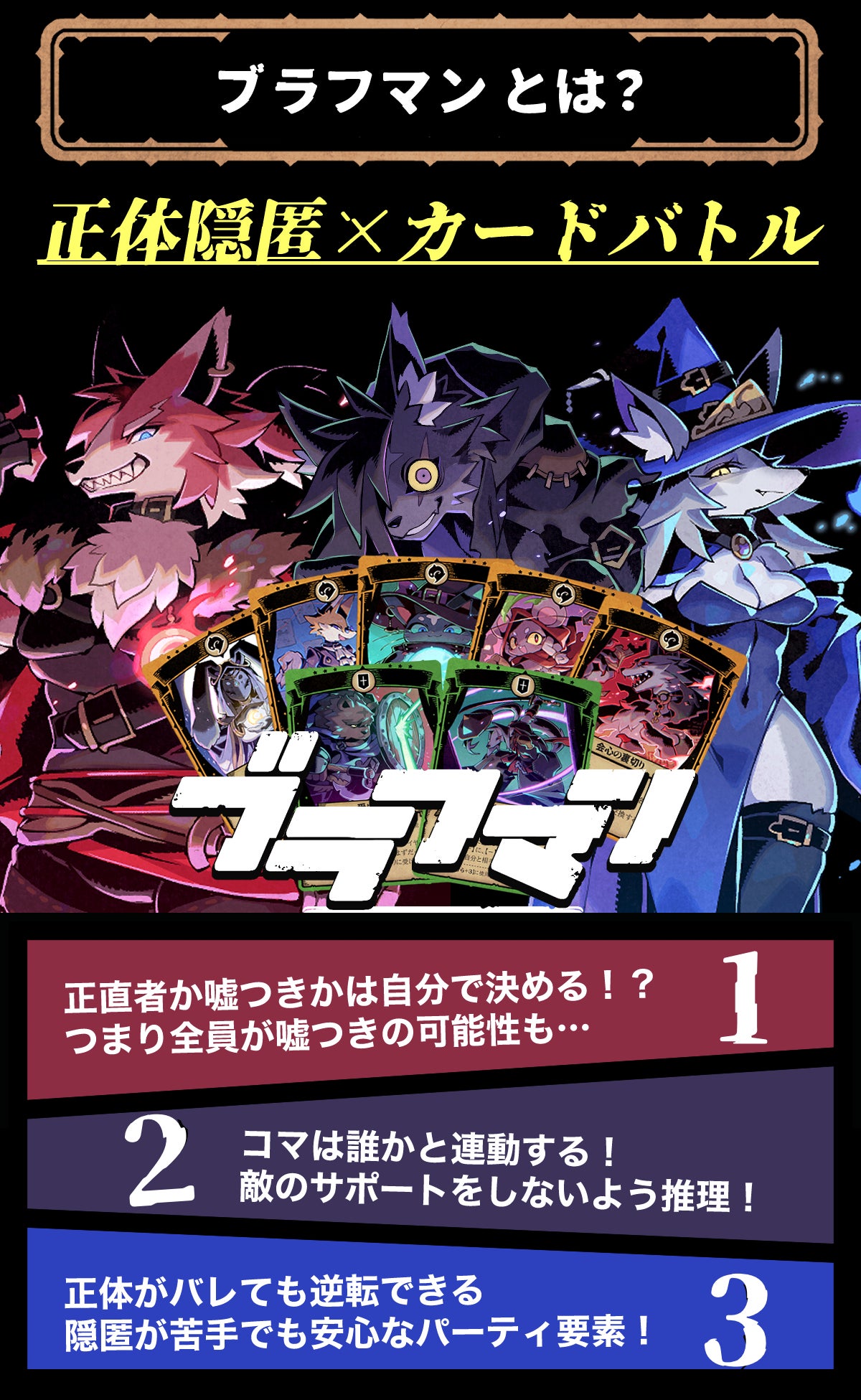 ブラフマンは全員が嘘をつくことができる【正体隠匿×カードバトル】ゲームです。このゲーム中は何を言っても、どれだけ嘘をついても大丈夫です。プレイヤー同士の会話とカードの効果を使って、推理し、妨害し、ときに裏切りながら、勝利を掴み取りましょう。