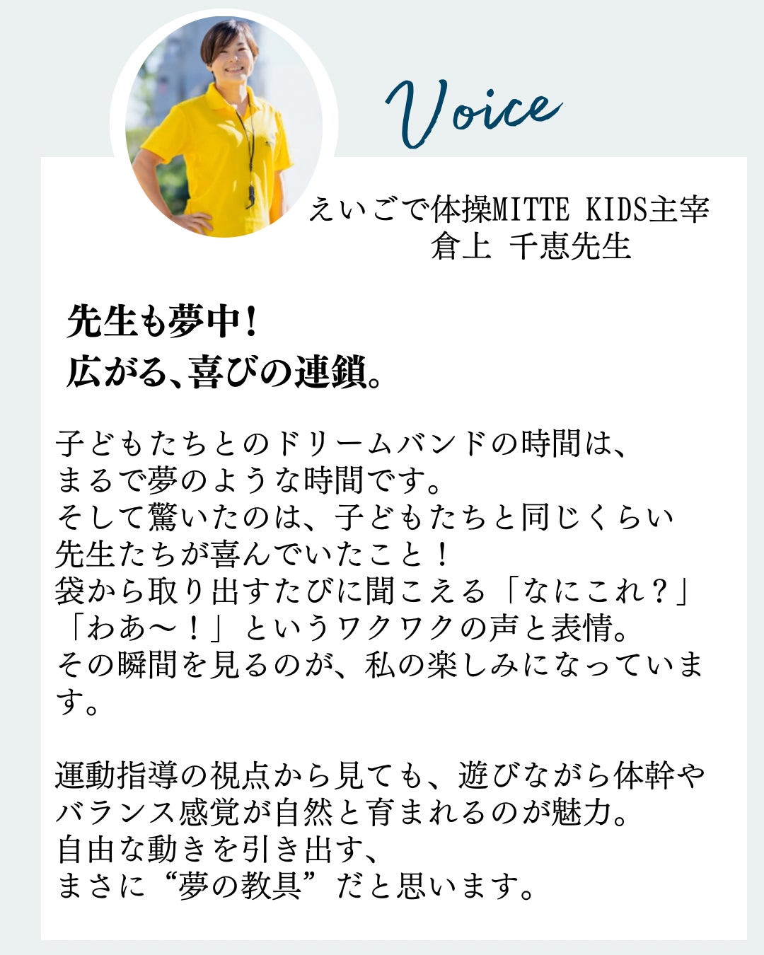 このドリームバンドは、保育や幼児教育の現場、高齢者施設、また発達に特性のあるお子さんへの療育活動など、さまざまな場面で活用されています。