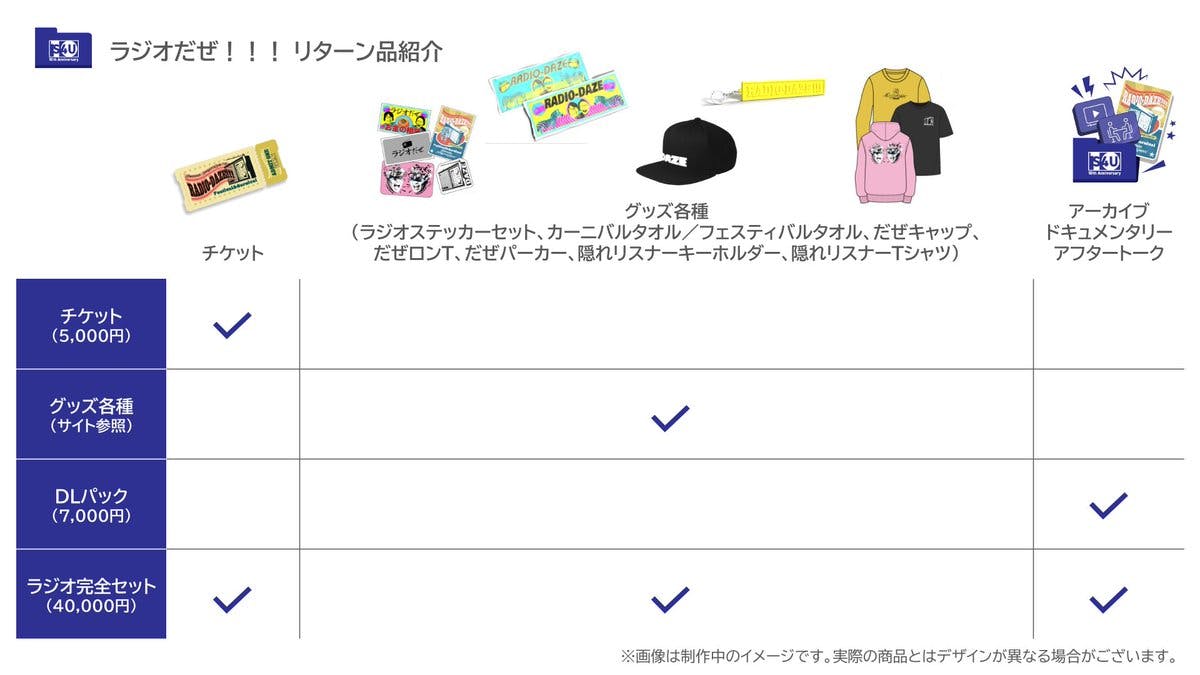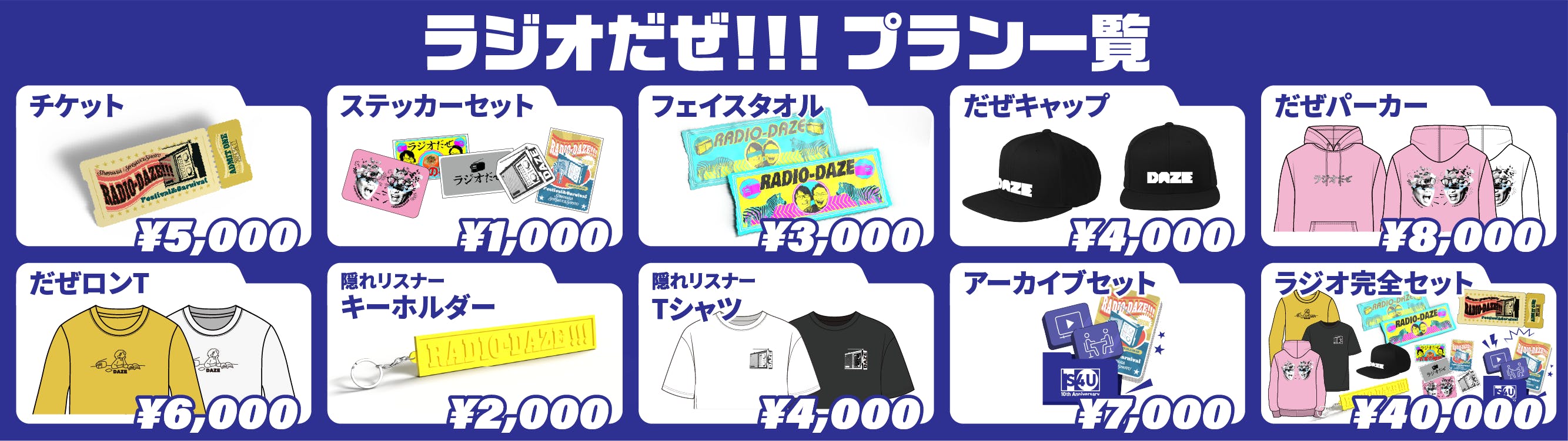 ▽チケット ▽ラジオステッカーセット ▽カーニバルタオル ▽フェスティバルタオル ▽だぜキャップ ▽だぜロンT ▽だぜパーカー ▽隠れリスナーキーホルダー ▽隠れリスナーTシャツ ▽アーカイブ DLコード ▽ドキュメンタリー DLコード ▽アフタートーク DLコード