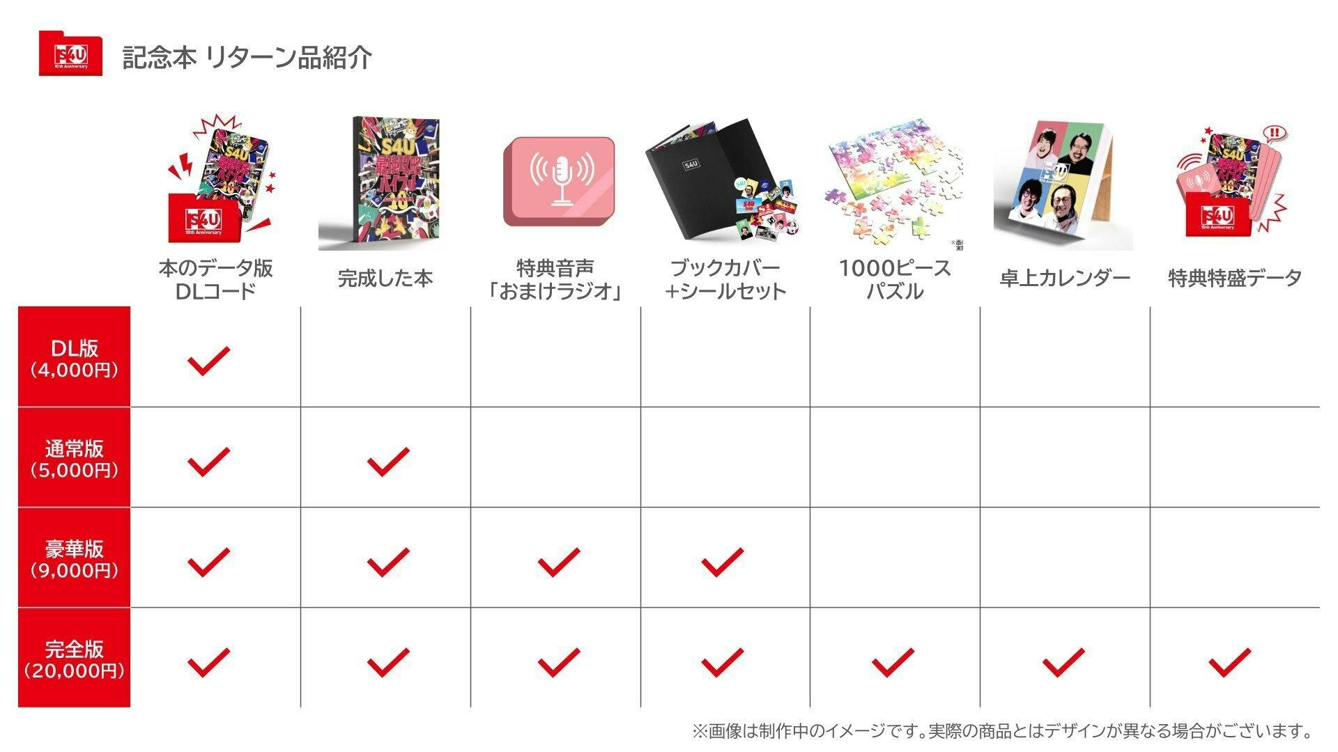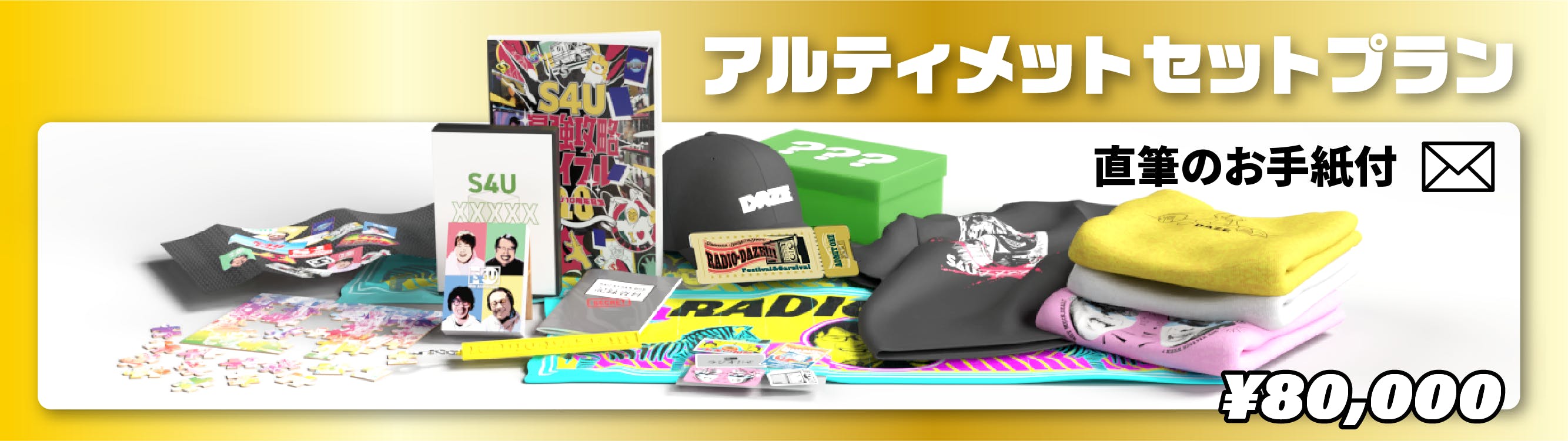 ▽直筆手紙 ▽DVD-BOX「S4U XXXXXX BOX」 ▽DVDのデータ版 DLコード ▽特典映像「座談会」 「制作ドキュメンタリー」DLコード ▽限定Tシャツ ▽限定ブックレット(制作日記・設定資料) ▽??? ▽10周年記念本「S4U最強攻略バイブル」 ▽記念本のデータ版 DLコード ▽特典音声「おまけラジオ」 ▽ブックカバー+シールセット ▽1000ピースパズル ▽卓上カレンダー ▽特典特盛データ ▽「ラジオだぜ!!! フェスティバル&カーニバル」イベントチケット ▽ラジオステッカーセット ▽カーニバルタオル ▽フェスティバルタオル ▽だぜキャップ ▽だぜロンT ▽だぜパーカー ▽隠れリスナーキーホルダー ▽隠れリスナーTシャツ ▽アーカイブ DLコード ▽ドキュメンタリー DLコード ▽アフタートーク DLコード