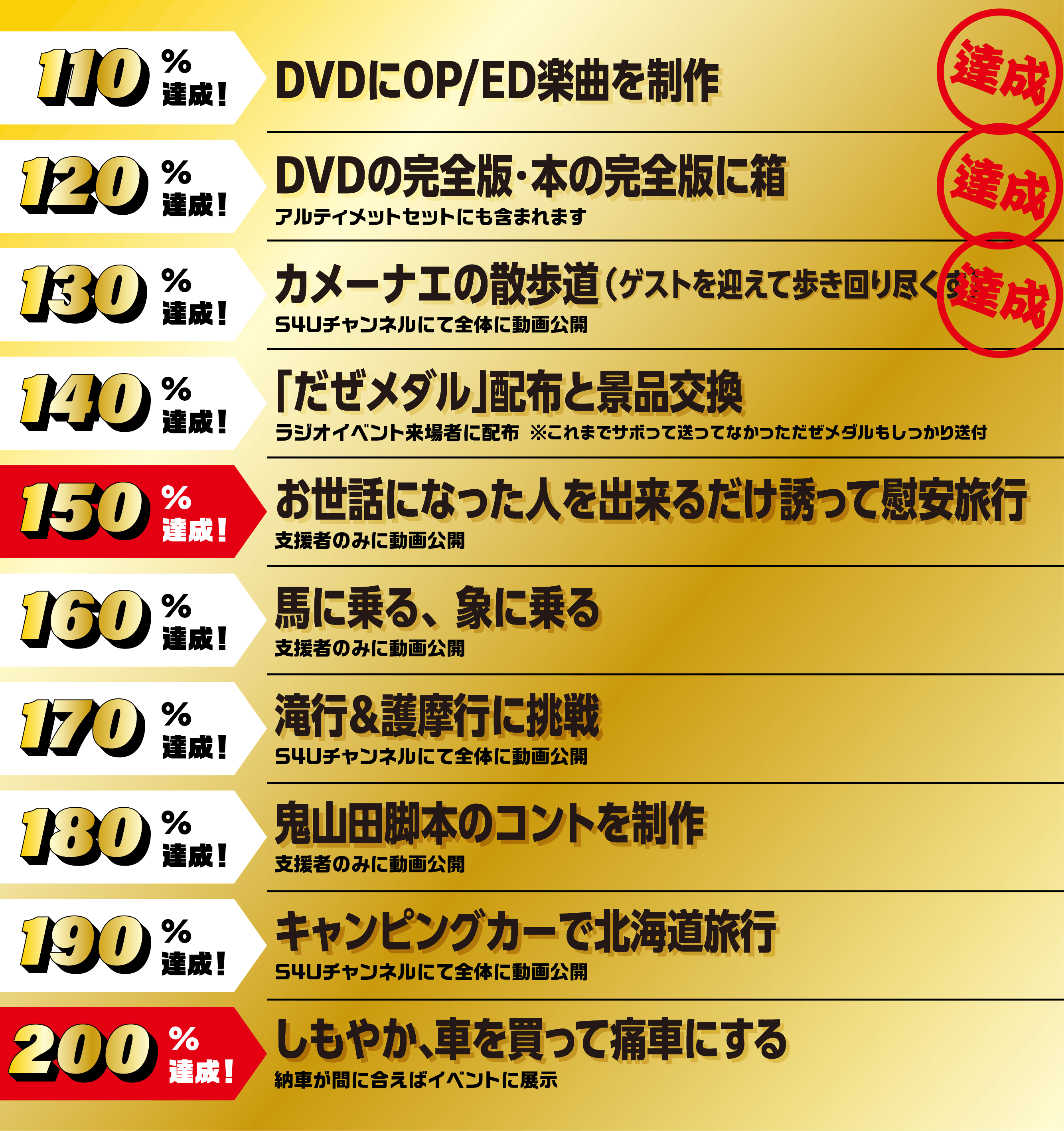 今回の目標はかなりハードルが高いです。これは別に前回ので味をしめたからではなく、必要な予算が本当にこれくらいかかるからです。その分、10年の集大成のような素晴らしいものをお届けしたい、皆様と楽しみたい、そういった思いを込めてのものになります。