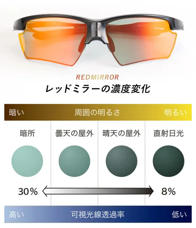 周囲の明るさに応じてレンズ濃度を自動で調節。可視光線透過率は、レッドミラーが約8%~30%の範囲で明るさを自動調節します。