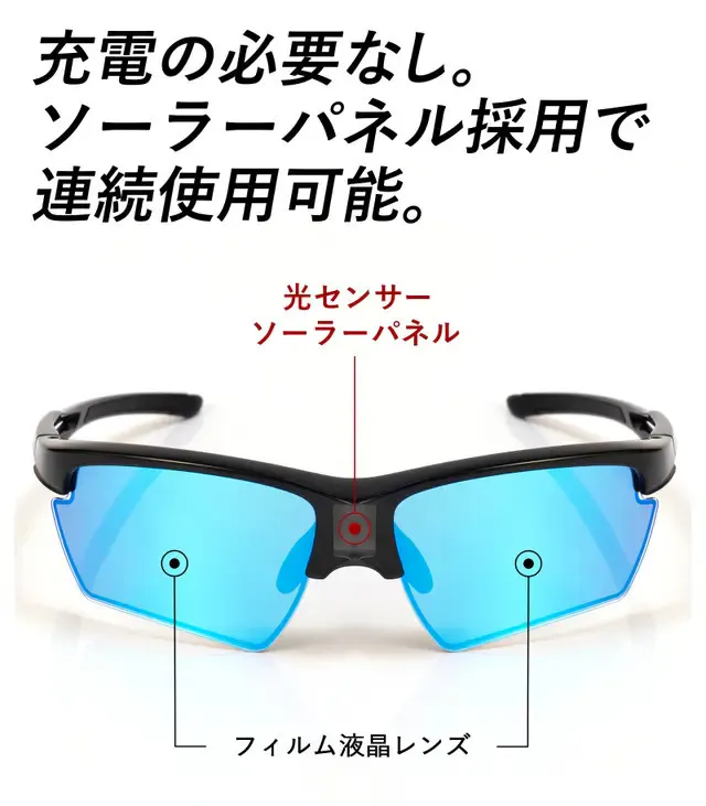 「A-FIT AF-801PMM」のレンズは、レンズの間に液晶フィルムを挟んだ高性能液晶調光レンズです。電卓と同じような仕組みで、本体中央部の集光部に光があたることにより調光機能が作動します。
