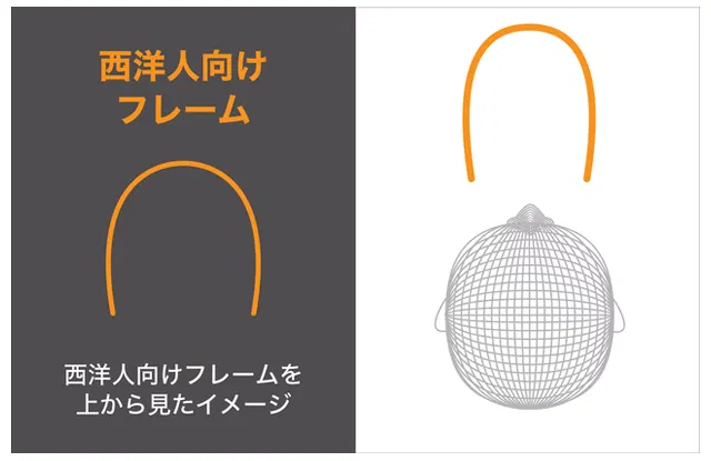 日本人が西洋人向けフレームをかけるとフレーム幅が狭く、フレームカーブがあわず前枠が押し出され、顔との間に隙間ができて光が入ったり、圧迫感を感じたりします。