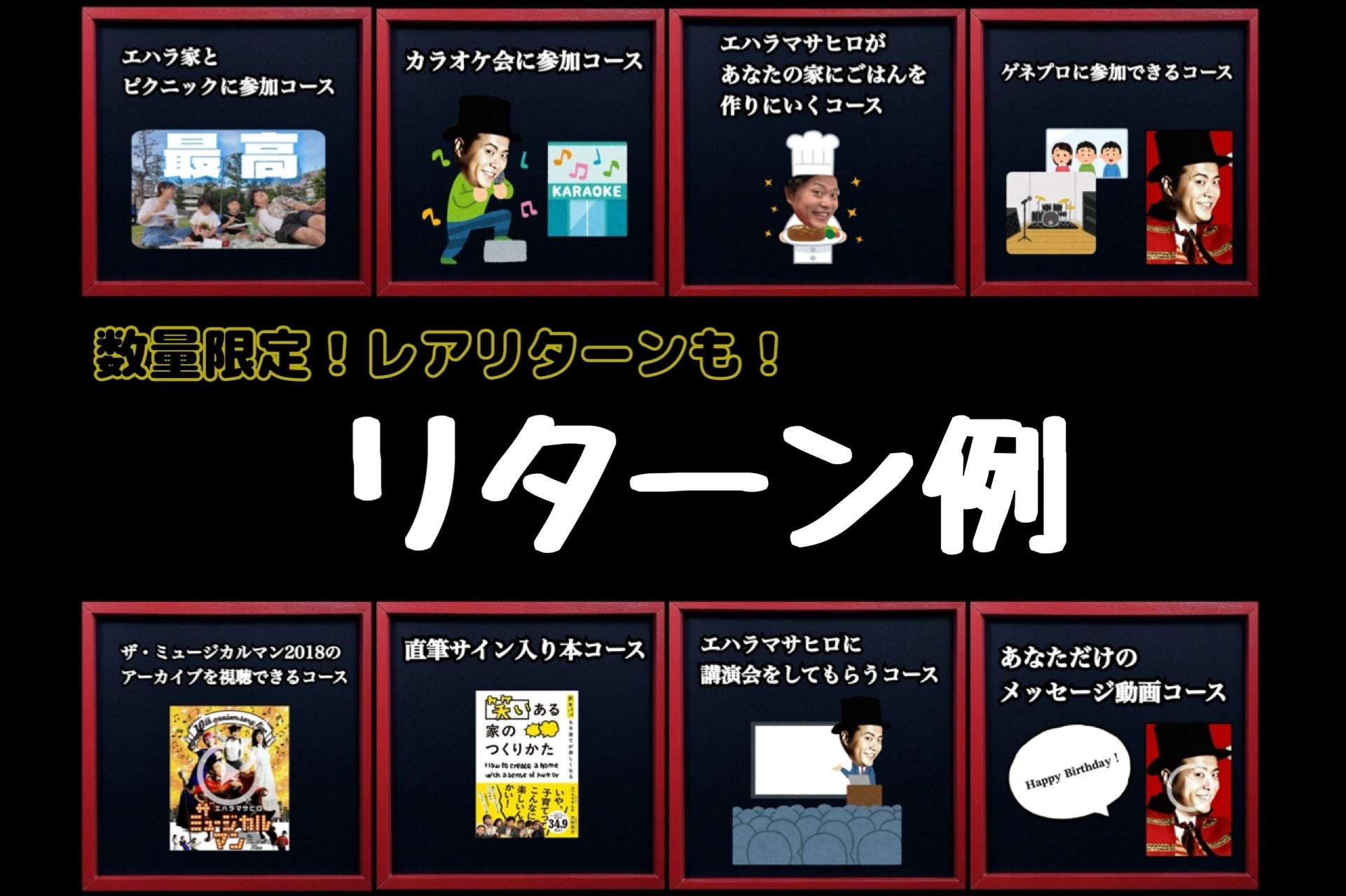 今回のプロジェクトでは、エハラマサヒロと一緒に楽しめる“クラファンならではの特別な体験”をリターンとしてご用意しました。
