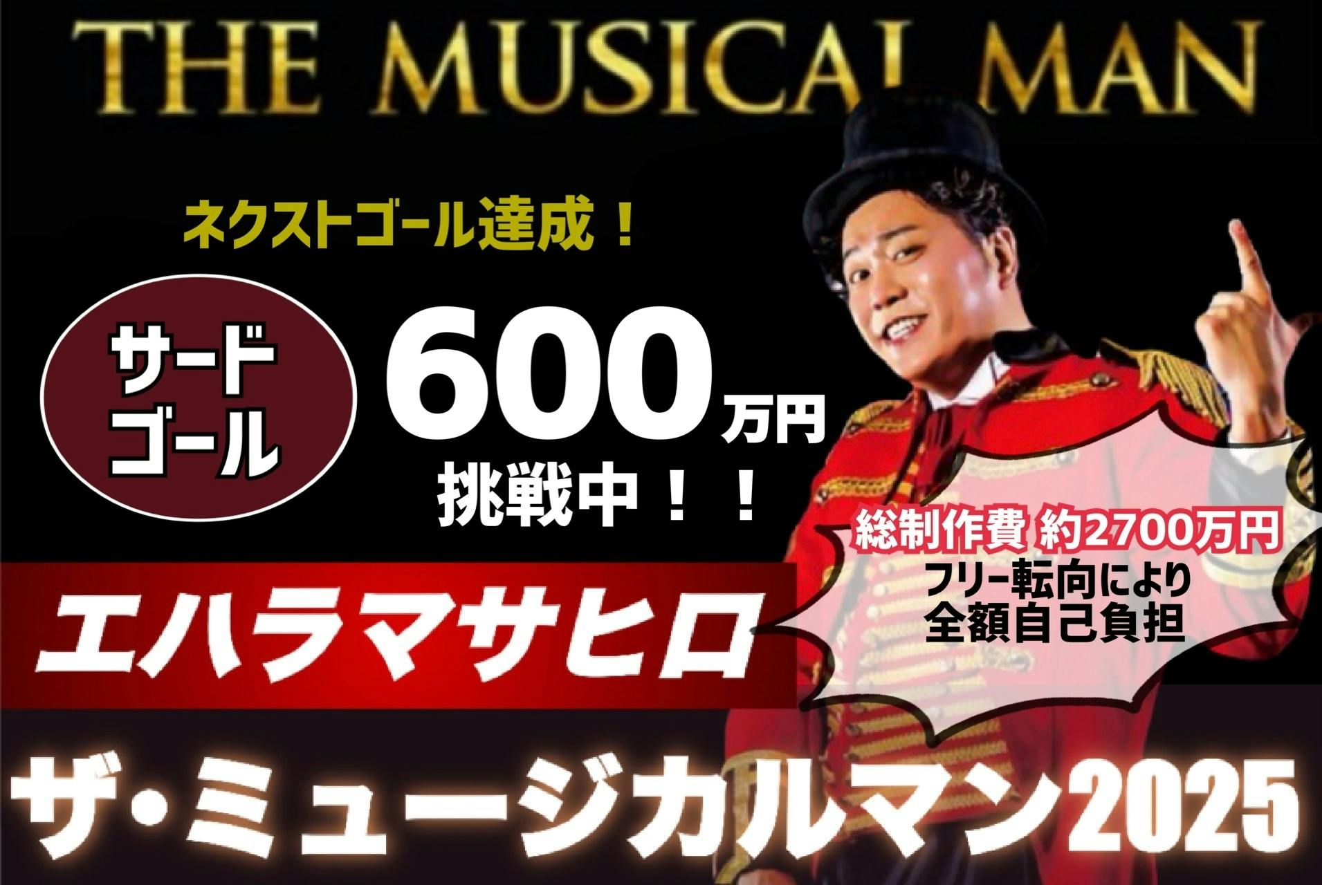 サードゴール600万円目指します!!ネクストゴール550万円達成により、サードゴール600万円を設定いたしました!終了まであと1日となりましたが、ミュージカルマンの更に高いクオリティのため、最後までご支援のほどどうぞよろしくお願いいたします。あたたかい応援コメントや、メッセージも沢山ありがとうございます。ひとつひとつ目を通しております。最後の駆け込み支援、SNSでの拡散など、どうかどうか皆様のお力添えをよろしくお願いいたします!!
