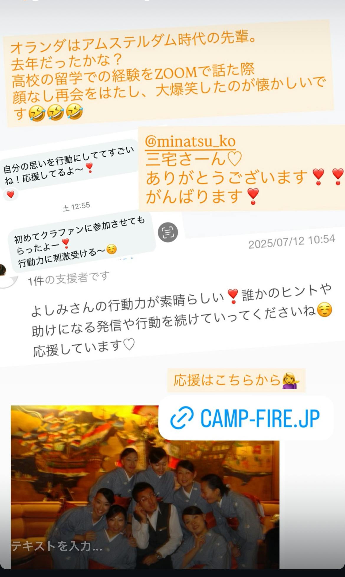 2025/07/15 06:00みなさん、おはようございます!!今回、このクラファンチャレンジするにあたり、たくさんの方が応援して下さり、本当に嬉しく思います♡ありがとうございます♡♡♡このクラファンの活動する中で、元職場の方たちとの繋がりがひろがりました。懐かしい気持ちになりました。当時、日本から離れ、異国の地で一緒に夢をかなえてきた仲間たち♡今は、住んでる地域はさまざまですが、それぞれの環境で今をいきている仲間たち♡たくさんの勇気をありがとうございます♡この記録が、今チャレンジ中の方や、これからチャレンジする方の勇気になりますように。よしみ もっと見る