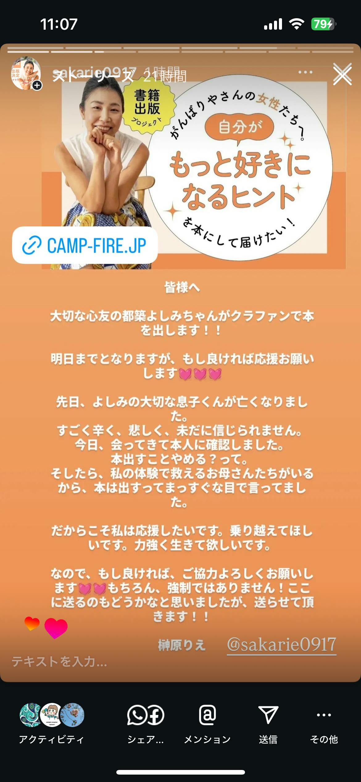 2025/07/31 11:25残り1日となりました。前回の報告から随分時が経過してしまいました。なかなか活動報告できず、そして動きが止まってしまったのは、、、、実は。悲しいお知らせですが、先日、わが家の末っ子がお空に旅立ちました。7歳でした。少しづつ少しづつですが、ほんの少しですが、日常に戻りつつあります。いつものように氣にかけてくれるお友達、家族に感謝しきれない毎日です。本当にありがとうございます。みなさんから応援いただいている書籍出版のためにクラウドファンディングに挑戦中の出来事でしたご支援いただいていた方たちには、投稿がいきなりなくなりご心配をおかけしましたごめんなさい。このような状況ではありますが、前向きに、母として、妻として、ひとりの女性として進む予定です。こんな状況でも前に進もうと決断したのは、お参りにきた方の一言でした。『慰めに来たけど、私の方が元気をもらえた。話してるだけで、悩みがなくなる』と涙して下さったお友達がいました。きっと、私の考え方や生き方が誰かの助けとなると思い、出版を続けることにしました。そして、お願いがあります。あと1日。やりぬきたいのでみなさま、拡散、シェアをお願いいたします!!!これからも応援、よろしくお願いいたします。 もっと見る