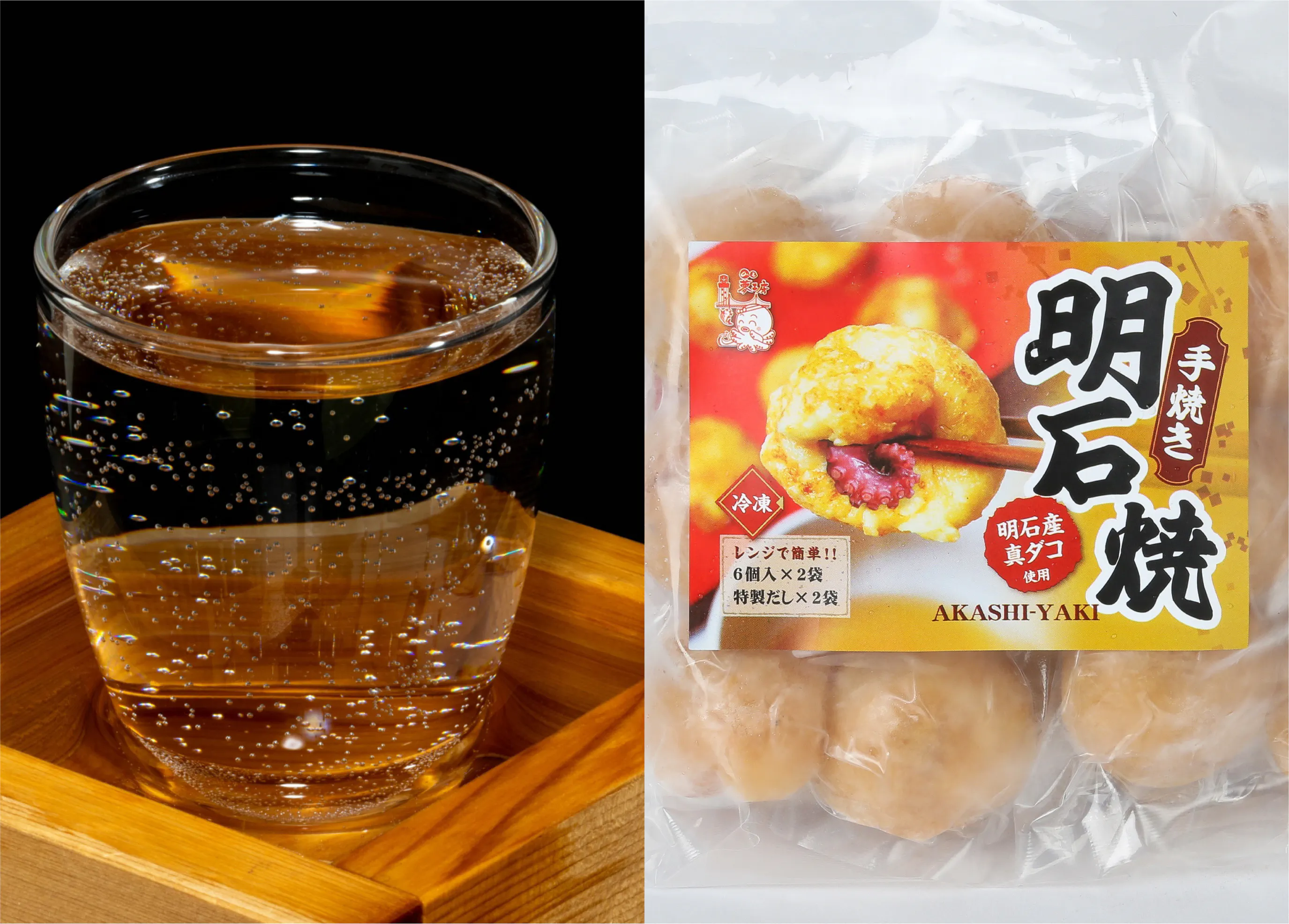 明石地元の蔵元、茨木酒造初のアッサンブラージュにより完成した、オリジナルの日本酒1本と、明石ダコを使用して手焼きで作る本場の明石焼(6玉)入りが2パックです。お出汁も1パックに2袋付いていますので、明石焼と日本酒のハーモニーを十分堪能いただけます。